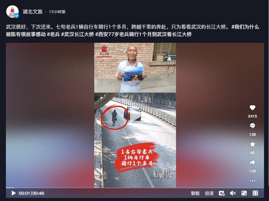 本文信源来自官方媒体【湖北文旅—武汉很好,下次还来。七旬老兵1辆自行车骑行1个多月,跨越千里的奔赴,只为看看武汉的长江大桥。#我们为什么被陈有银故事感动#老兵#武汉长江大桥#西安77岁老兵骑行1个月到武汉看长江大桥】