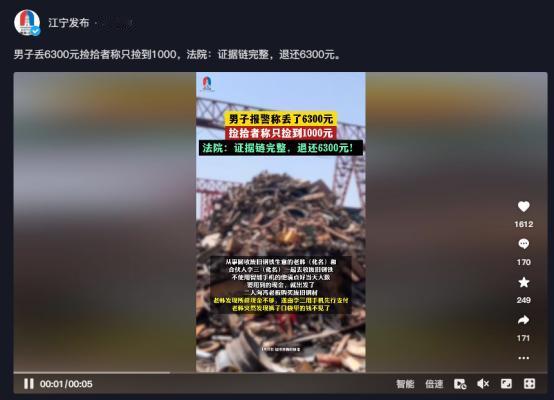 本文信源来自官方媒体【江宁发布—男子丢6300元捡拾者称只捡到1000,法院:证据链完整,退还6300元。】