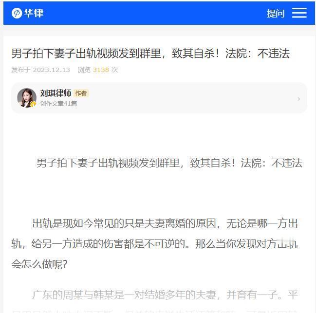 本文信源来自官方媒体【刘琪律师—男子拍下妻子出轨视频发到群里,致其自杀!法院:不违法】