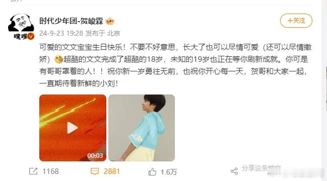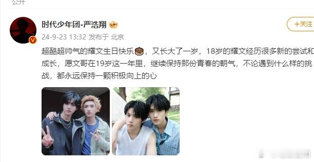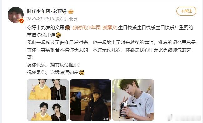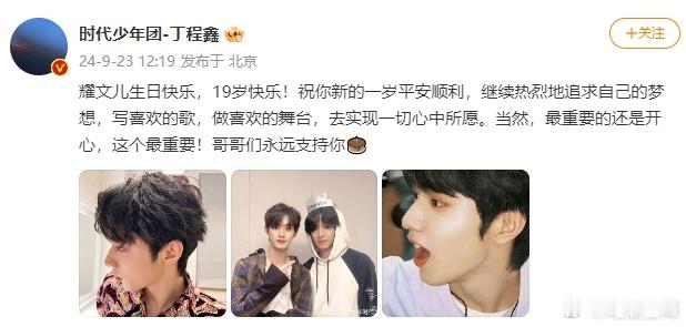 #时代少年团全员发博为刘耀文庆生##时代少年团全员晒照为刘耀文庆生# 十九岁的少年郎,刘耀文朝气蓬勃。兄弟们的祝福,是最温暖的阳光。祝耀文生日快乐,前程似锦。