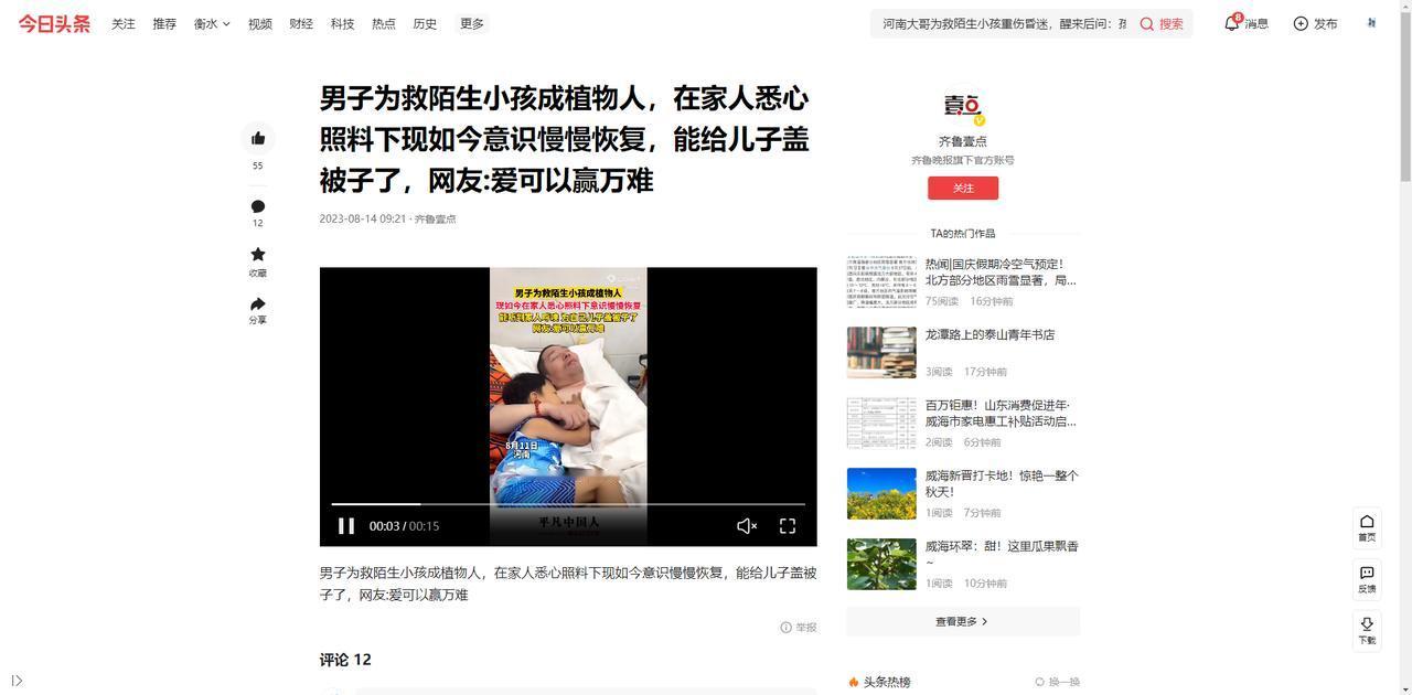 本文信源来自官方媒体【齐鲁壹点—男子为救陌生小孩成植物人,在家人悉心照料下现如今意识慢慢恢复,能给儿子盖被子了,网友:爱可以赢万难】
