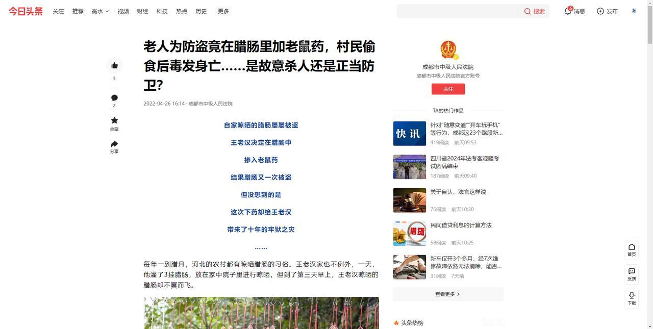 本文信源来自官方媒体【成都市中级人民法院—老人为防盗竟在腊肠里加老鼠药,村民偷食后毒发身亡……是故意杀人还是正当防卫?】