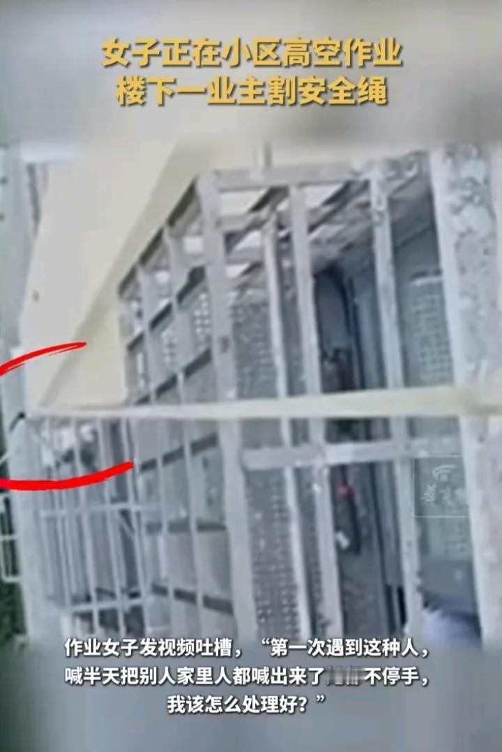 安徽合肥,一女子腰间系着安全绳,在12楼外面粉刷墙面,突然感觉到身体一阵晃动,吓破了胆。赶紧低头看去,只见楼下老太太正在用刀子割绳子。女子赶紧厉声呵斥:你不要割绳子,割绳子犯法。随后,老太太老伴出来了:绳子在我家墙外,我们想割就割,你管得着吗?网友:难道老太太想杀人吗?
