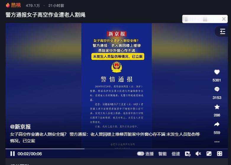 本文信源来自官方媒体【新京报—女子高空作业遭老人割安全绳?警方通报:老人曾因楼上维修弄脏家中外窗心存不满未发生人员坠伤等情况,已立案】