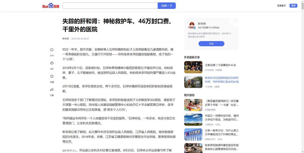本文信源来自官方媒体【新京报—失踪的肝和肾:神秘救护车、46万封口费、千里外的医院】