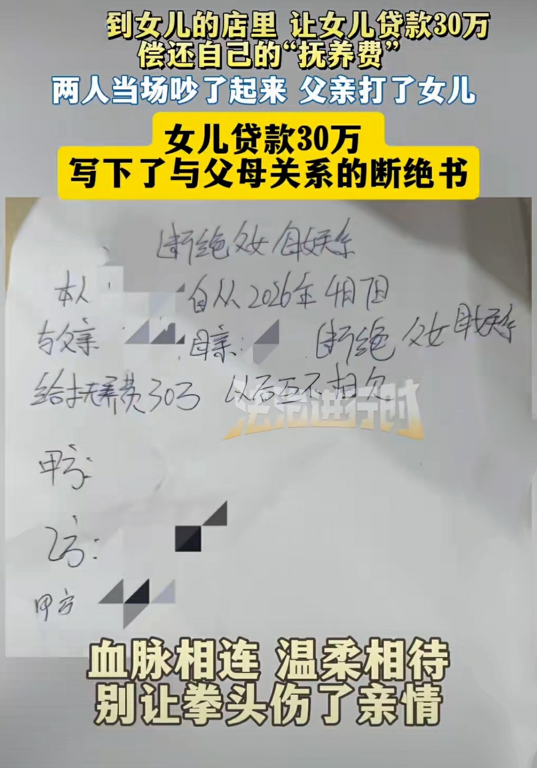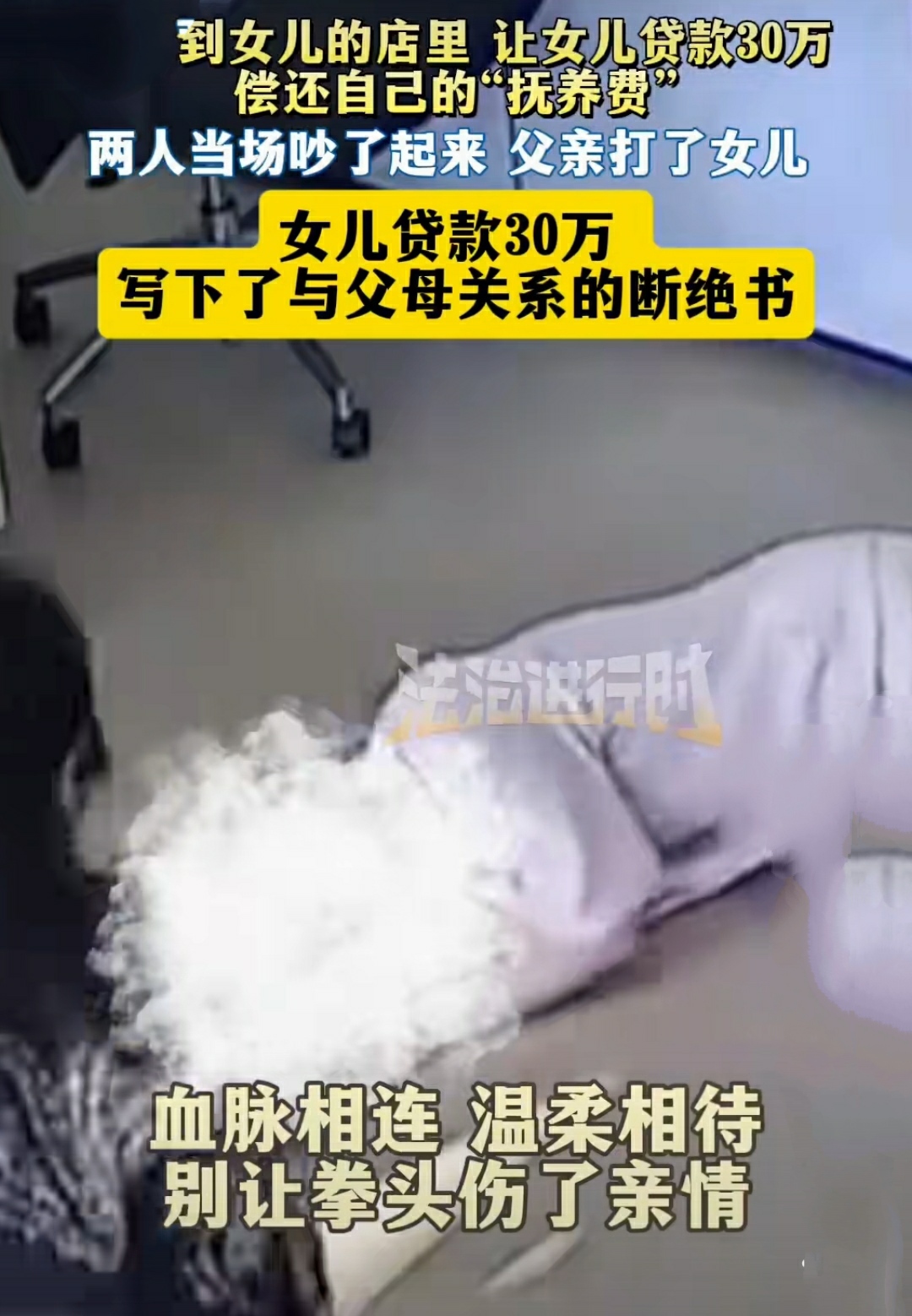最近全网都被一件离谱家事整破防了!一位父亲直接冲到女儿开的店里,当众逼女儿贷款30万,美其名曰“偿还从小到大的抚养费”,女儿不肯就动手打人,把姑娘逼到持刀抵颈、当场写断绝关系书,看完真的气得抠脚!