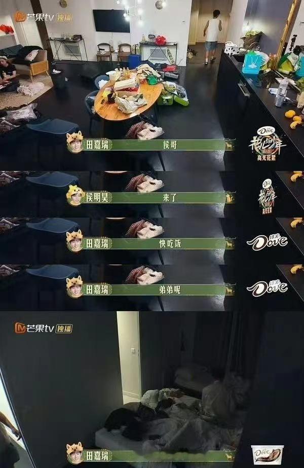 #花少4个人吃9人餐事情始末##陈好、宋茜没晚饭,周雨彤、田嘉瑞有留饭。侯明昊想先采访不想吃,周雨彤劝他。刘烨卸妆后被周雨彤喊吃饭。节目组先炒热度再放花絮,这小心思