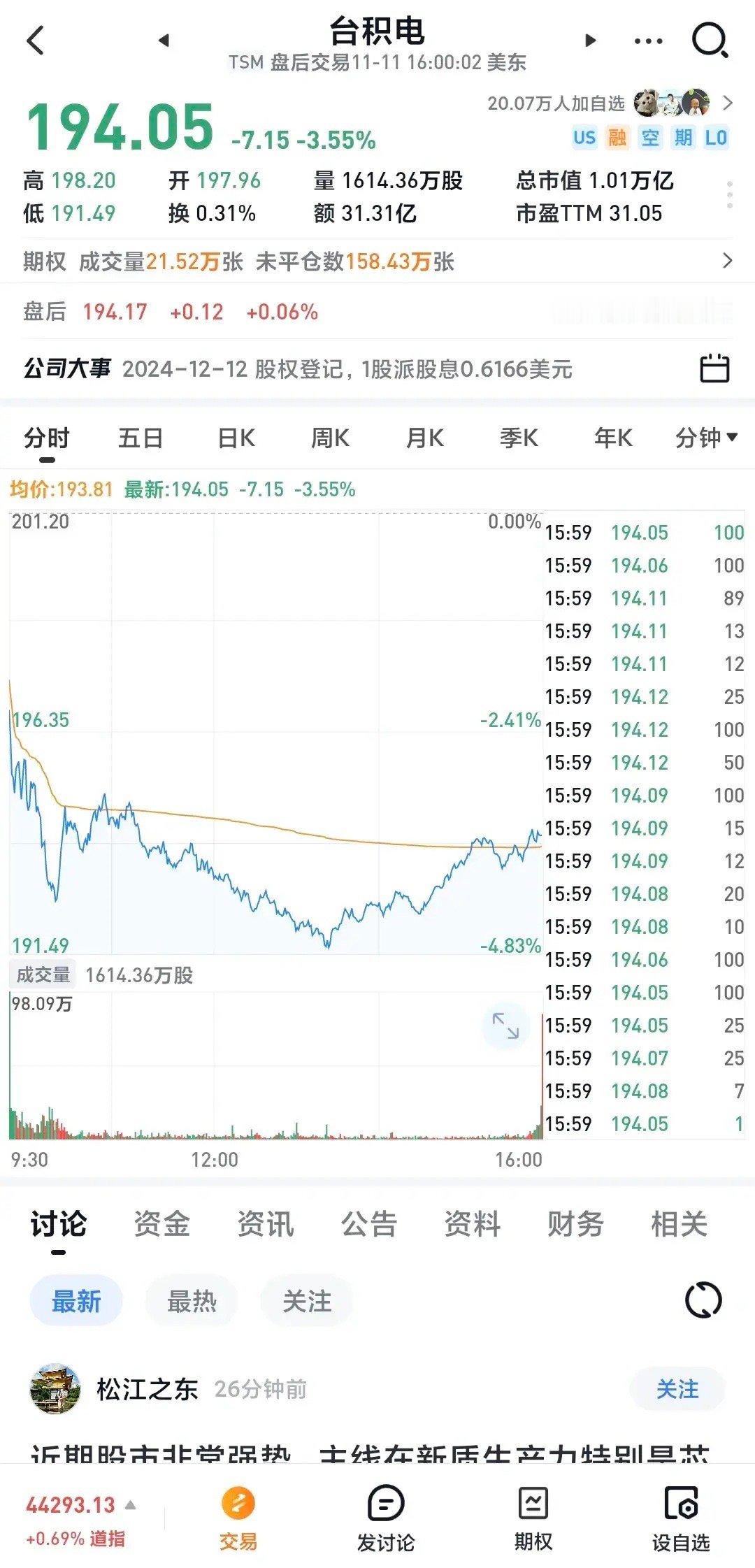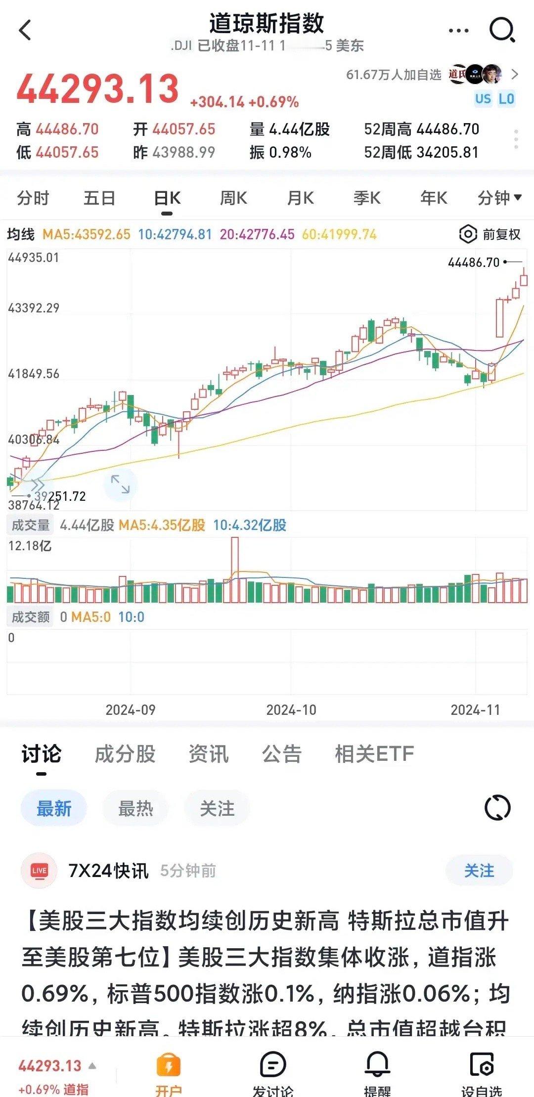 道琼斯指数收于44293.13点,上涨304.14点,涨幅0.69%,盘中最高点44486.70点,再创历史新高。