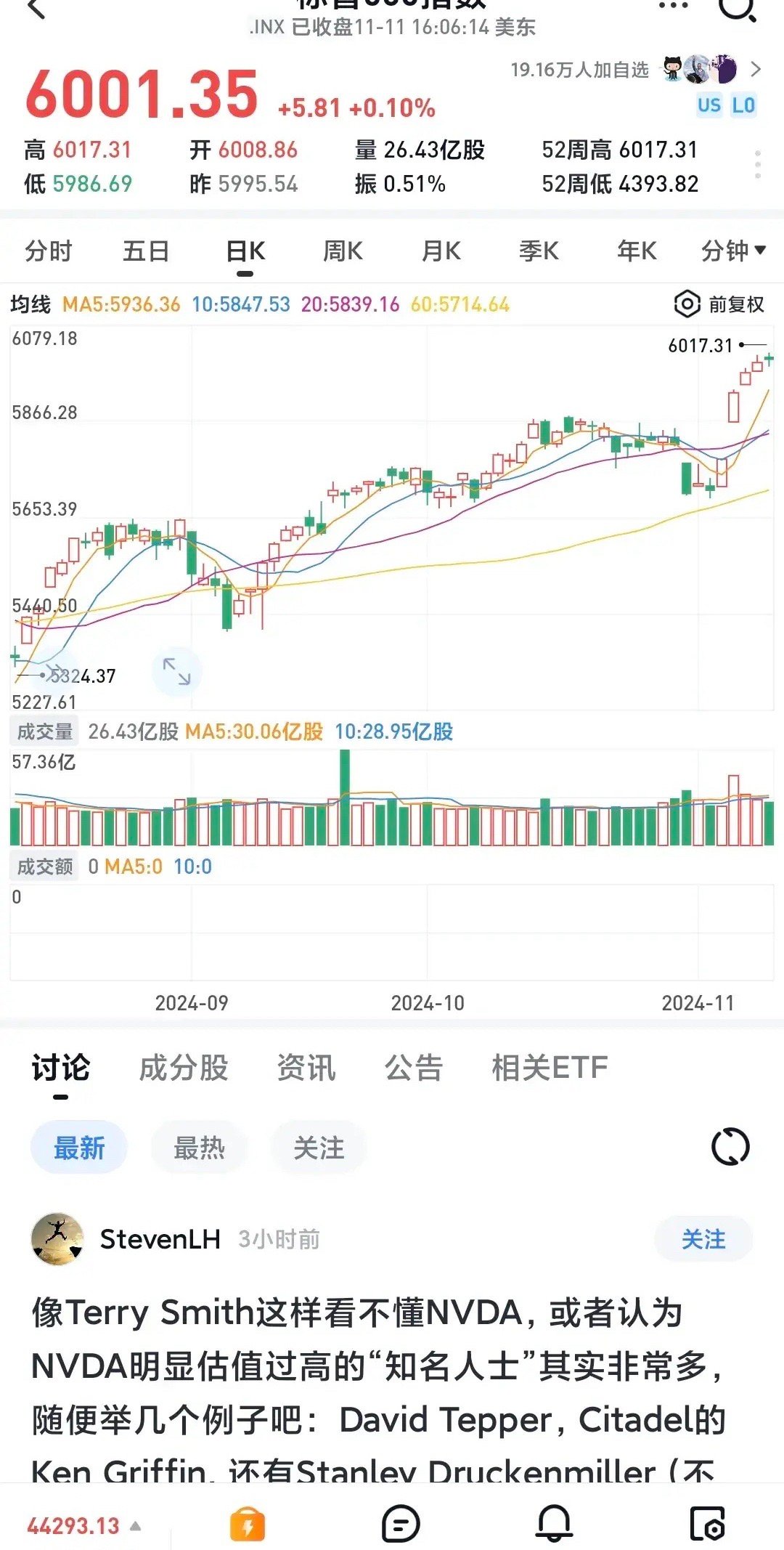 标普500指数收于6001.35点,上涨5.81点,涨幅0.1%,盘中最高点6017.31点,再创历史新高。
