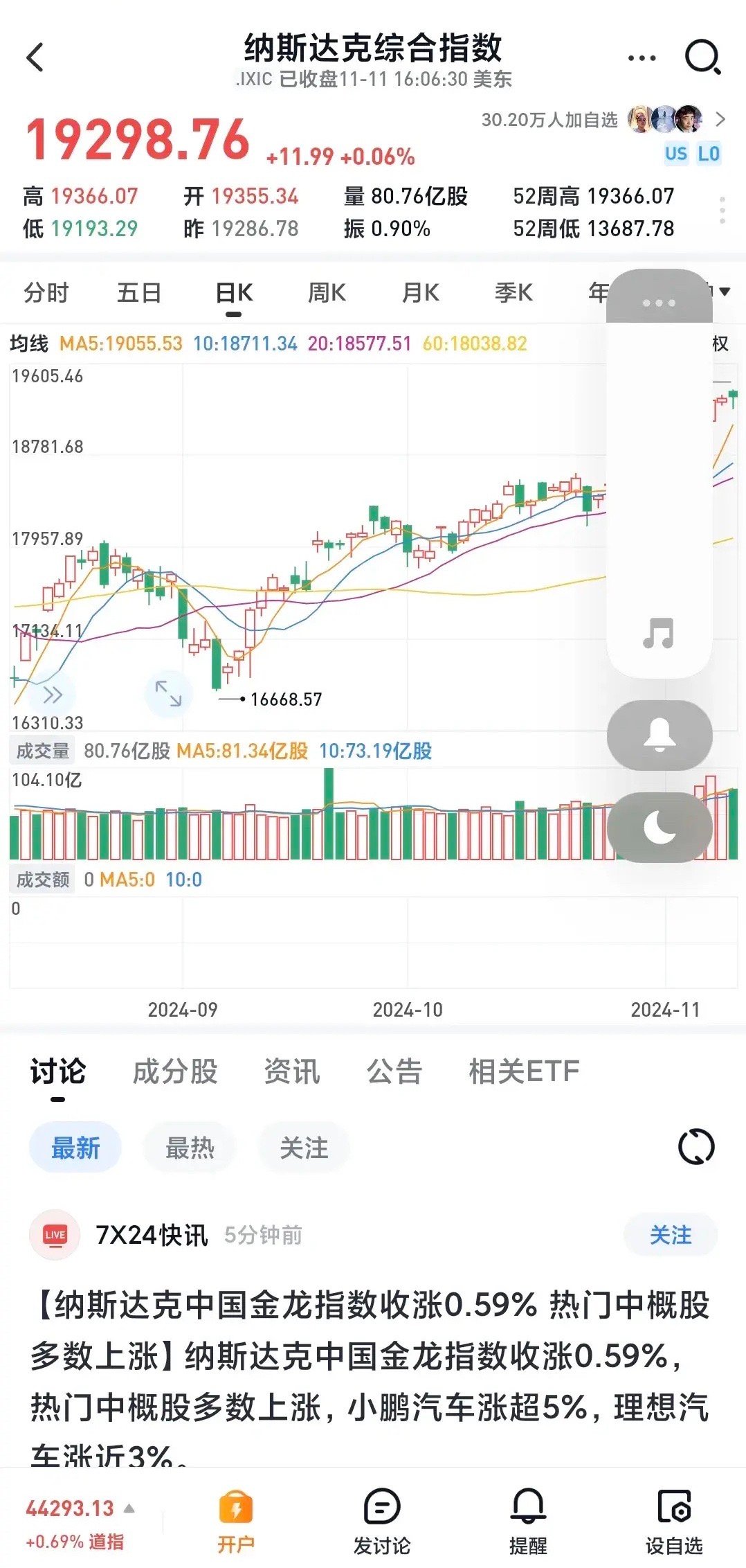 纳斯达克指数收于19298.76点,上涨11.99点,涨幅0.06%,盘中最高点19366.07点,再创历史新高。