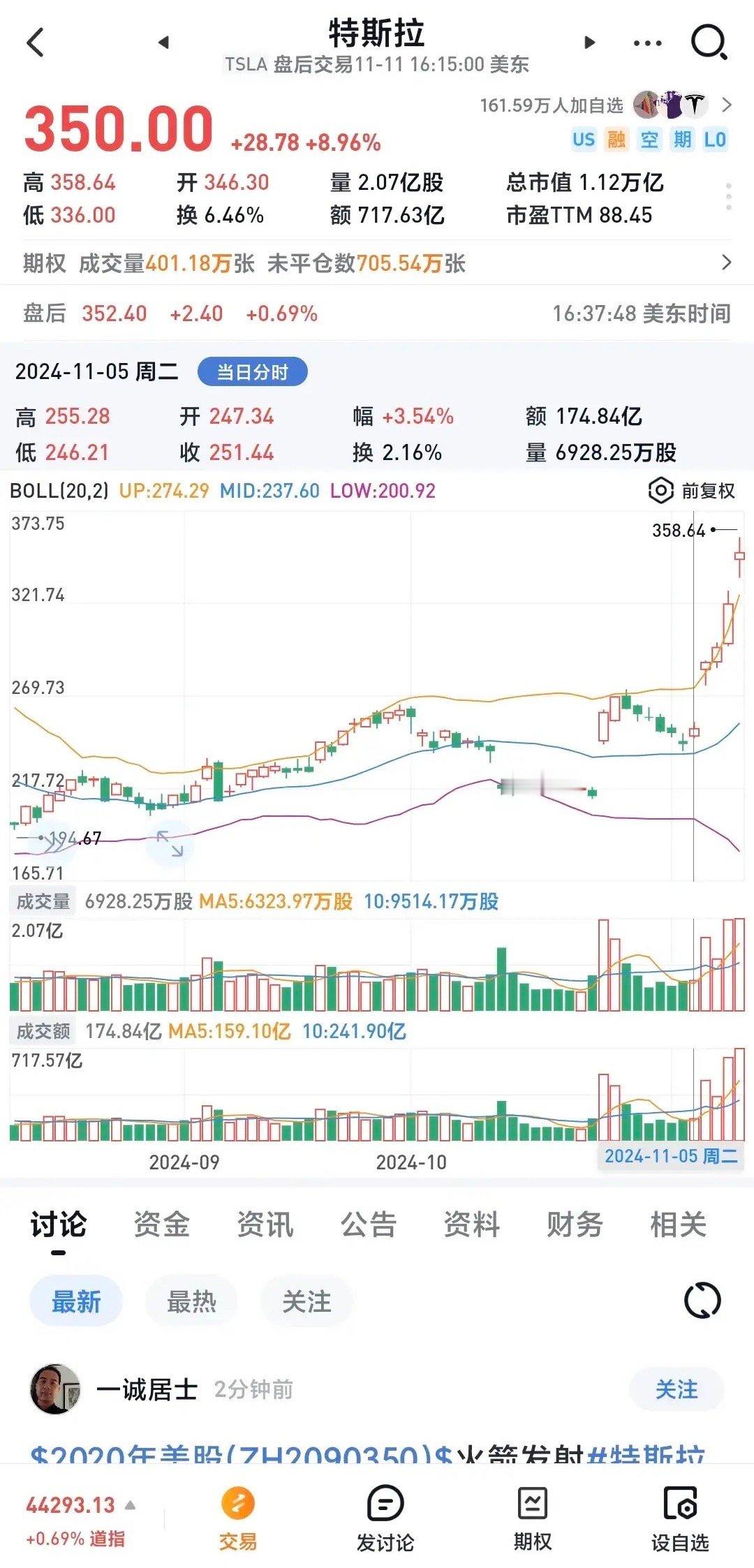 截止收盘,特斯拉股票收于350.32$,上涨29.10$,涨幅9.06%,从特朗普当选后特斯拉仅仅4天股票从246.21$已经上涨104.11$四天涨幅达到42.3%市值由7870亿$上涨到1.12万亿$,现在特斯拉的市值已经超过台积电和巴菲特的伯克希尔,是全球市值第8的公司。四天市值增加了3330亿美元(2.5万亿元RMB),增加的市值比A股最高市值的茅台还多20%。本周特斯拉股价有望突破400美元,市值有望达到1.3万亿$。