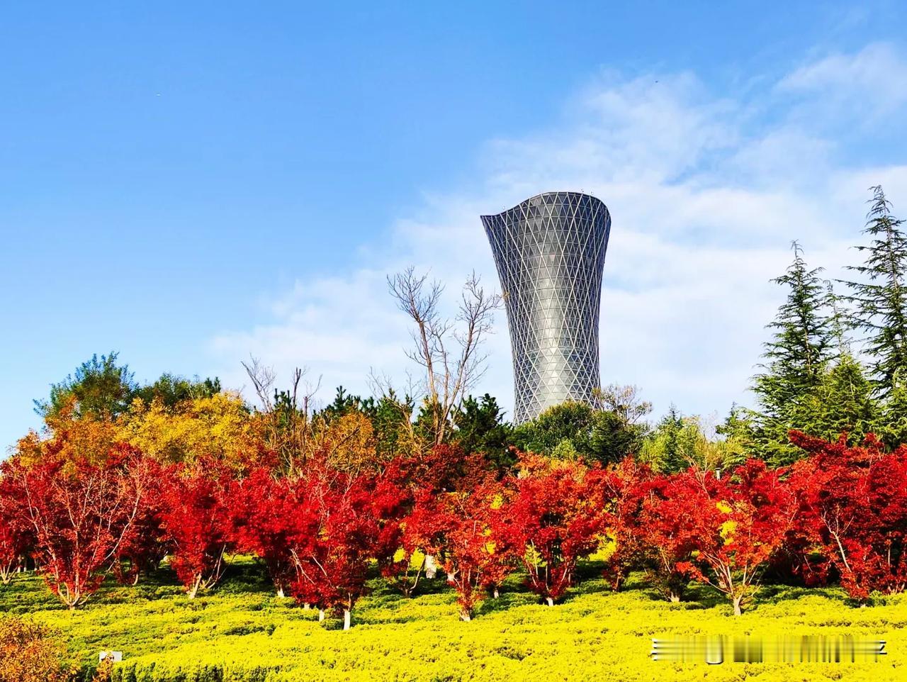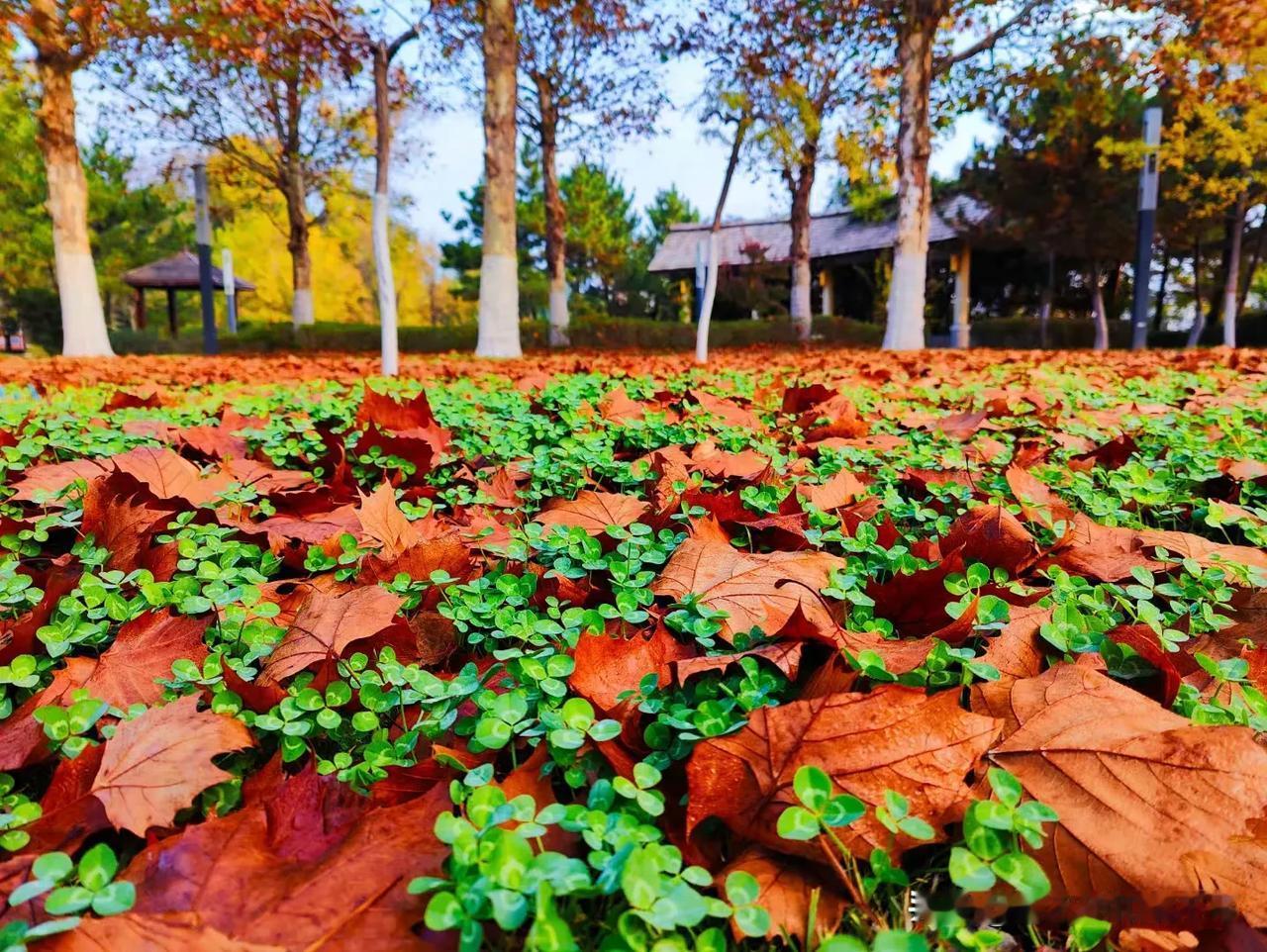 地上的落叶也掩盖不住勃勃生机的绿叶小草,不远处红黄绿层峦叠嶂的颜色,一派姹紫嫣红的景象,仿佛到了春天的错觉!