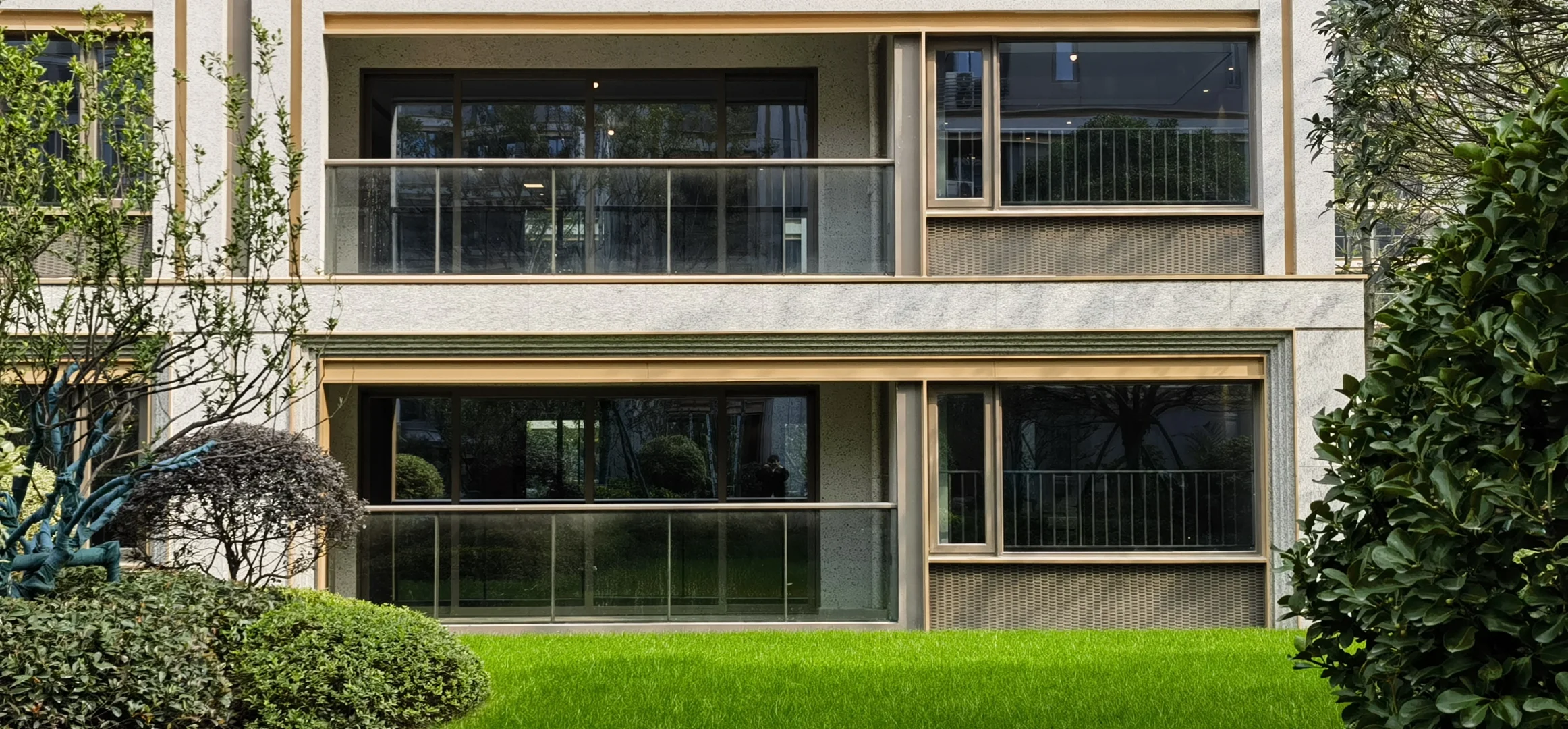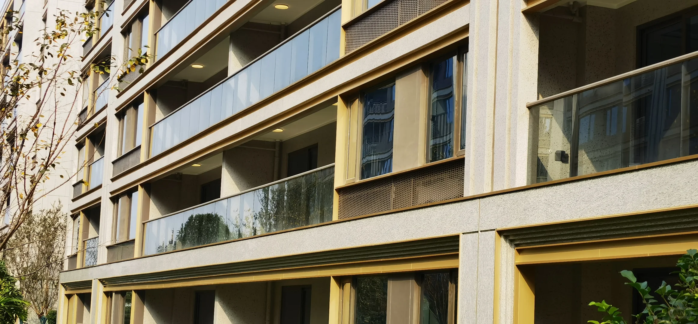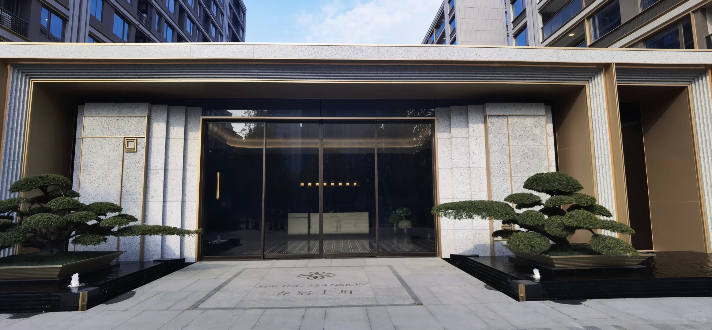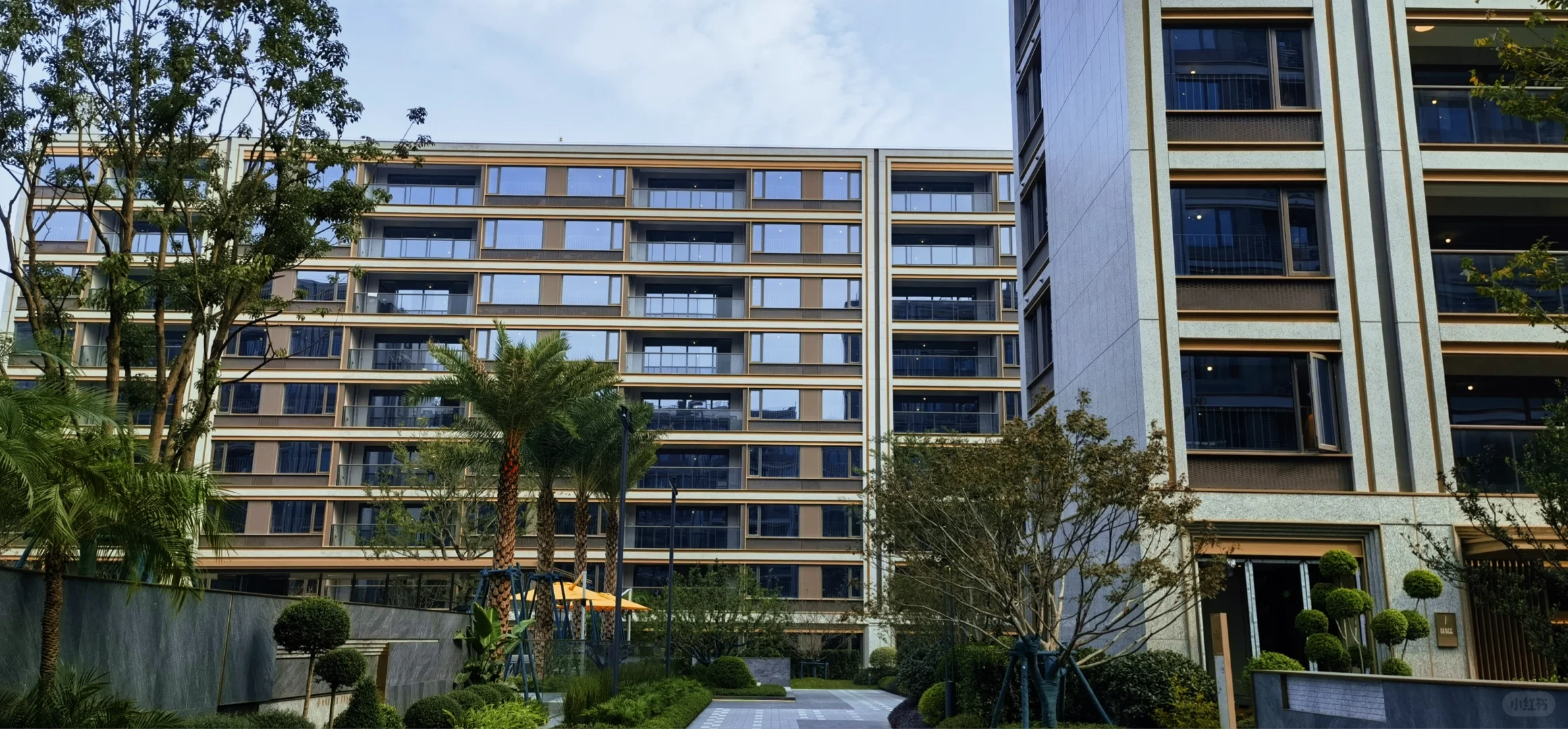 2、春宸上府是三家开发商合作的,但产品设计和工程都是大家负责的,所以它的大家风格也很明显,最突出的反映在立面上,浅灰色+深灰色+金色的立面配色组合真的很大家,远看就像一个个油画框,对比于周边几个小区让人耳目一新。主入口大门、单元楼门厅、架空层部分还做了很多格栅交叠的斯卡帕元素设计,大大提升了高级感。