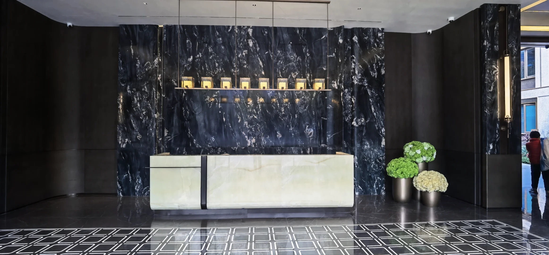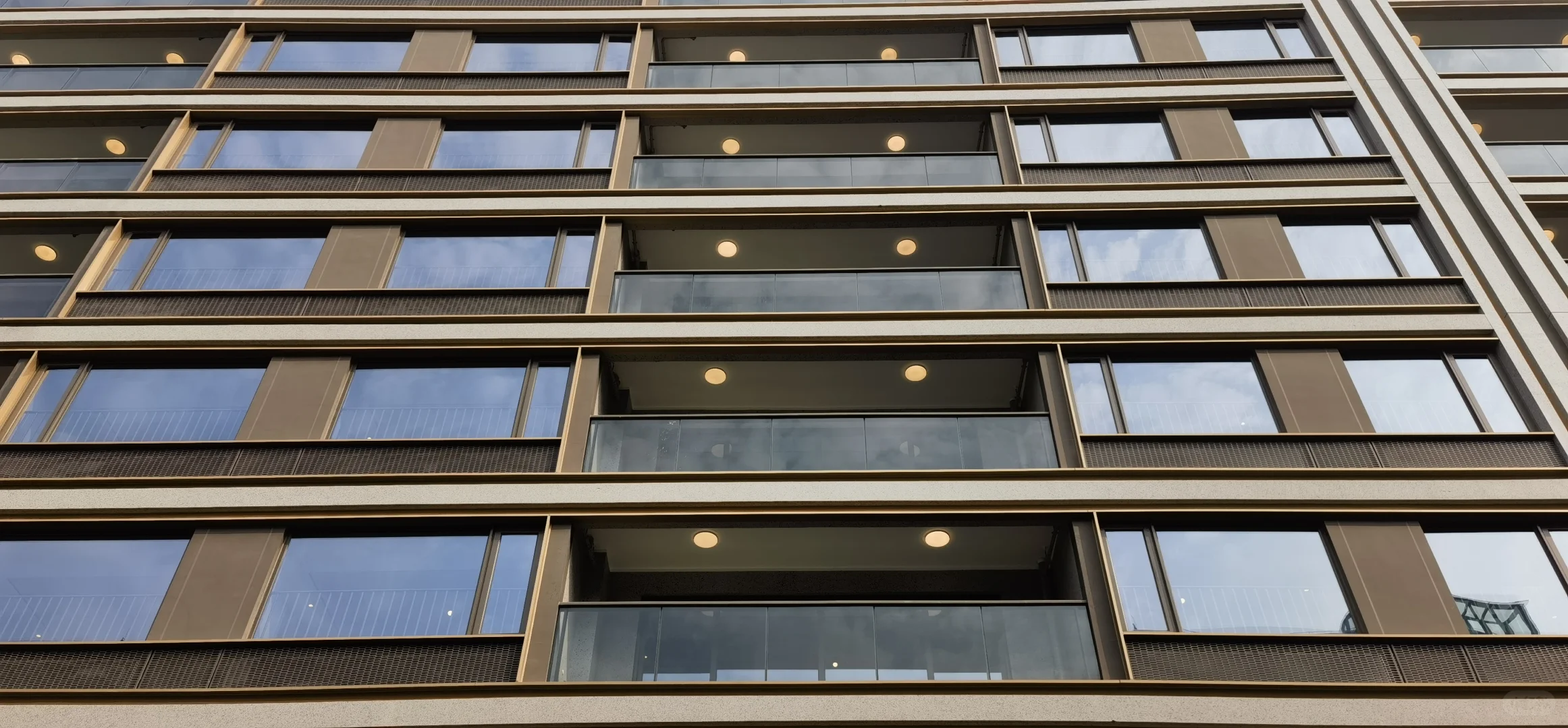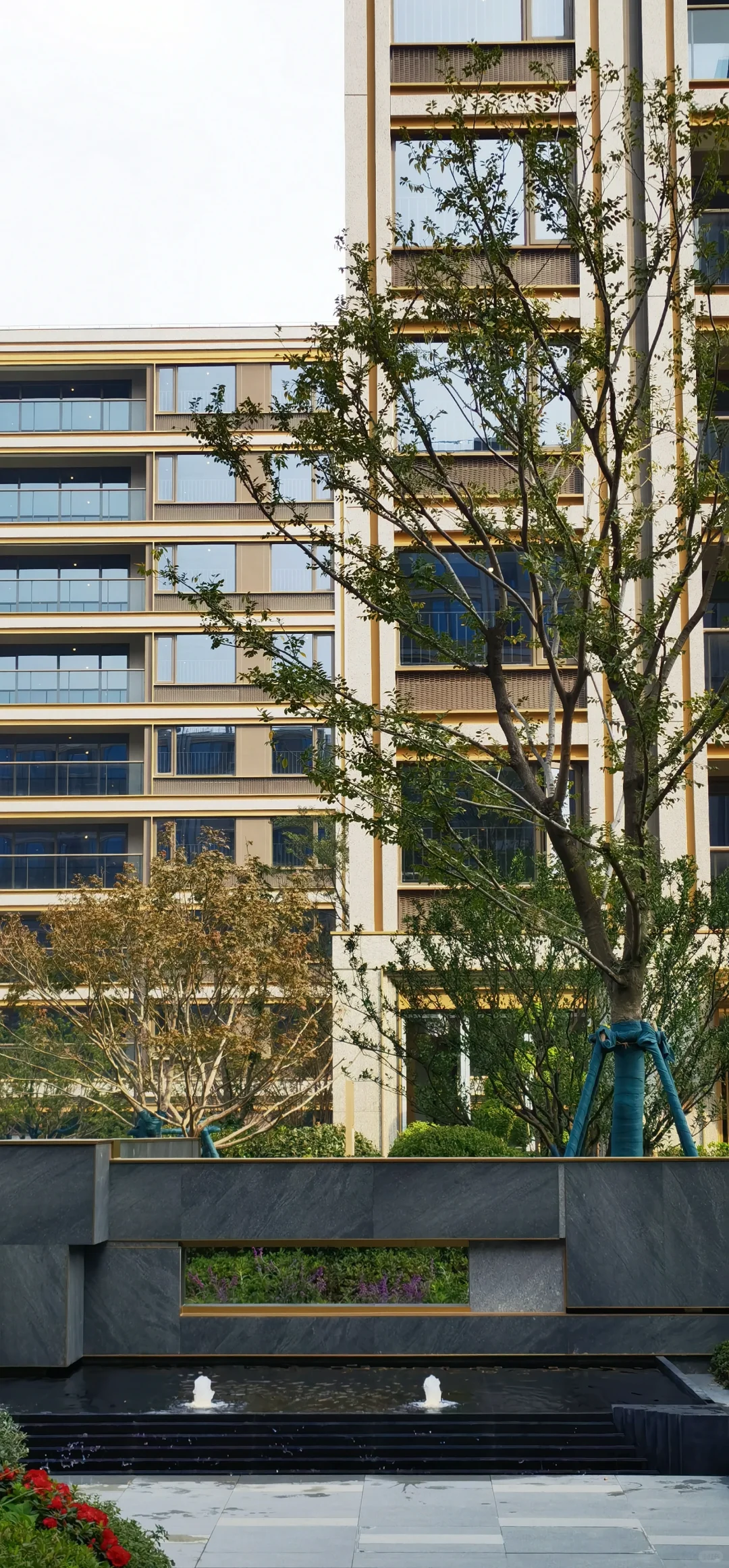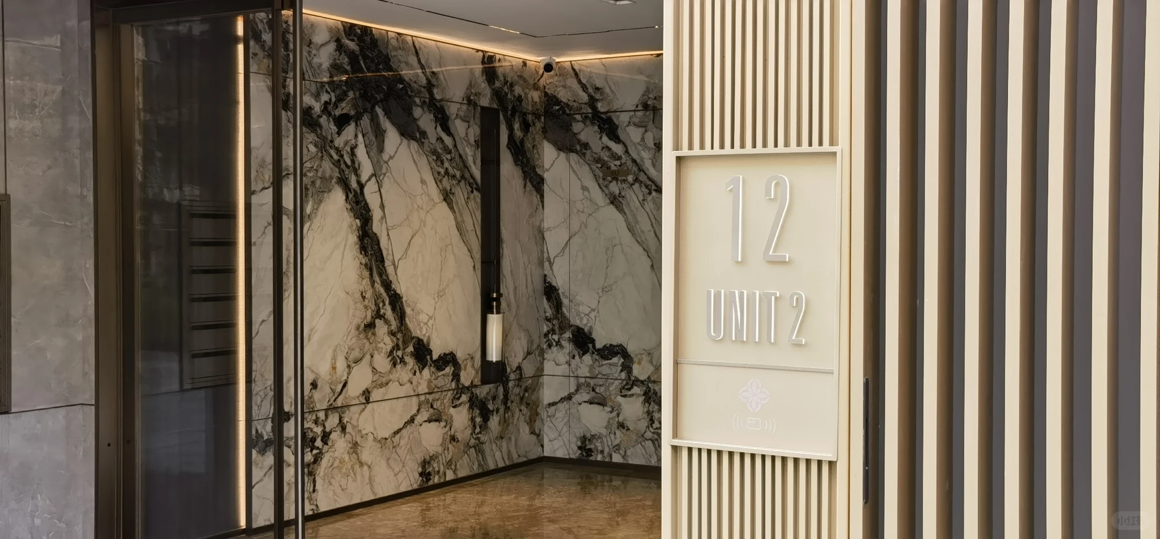 2、春宸上府是三家开发商合作的,但产品设计和工程都是大家负责的,所以它的大家风格也很明显,最突出的反映在立面上,浅灰色+深灰色+金色的立面配色组合真的很大家,远看就像一个个油画框,对比于周边几个小区让人耳目一新。主入口大门、单元楼门厅、架空层部分还做了很多格栅交叠的斯卡帕元素设计,大大提升了高级感。