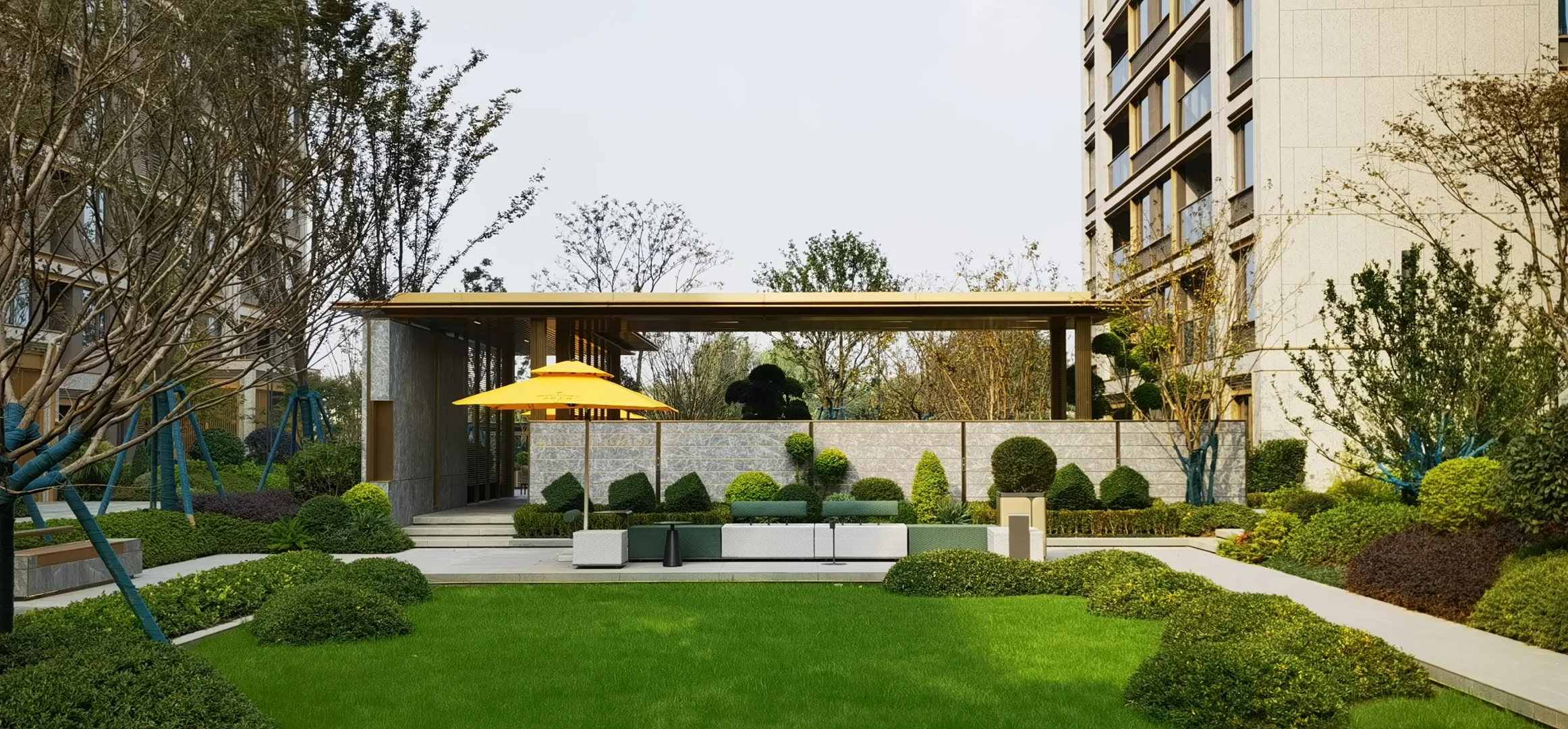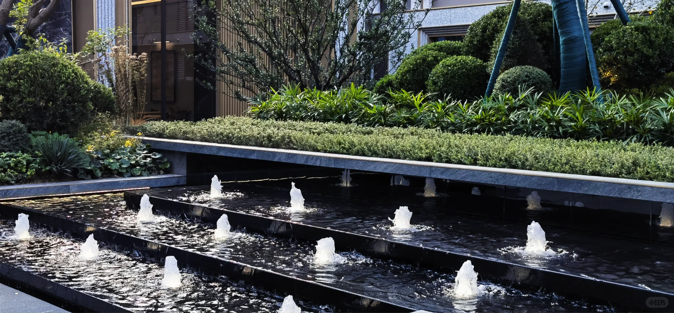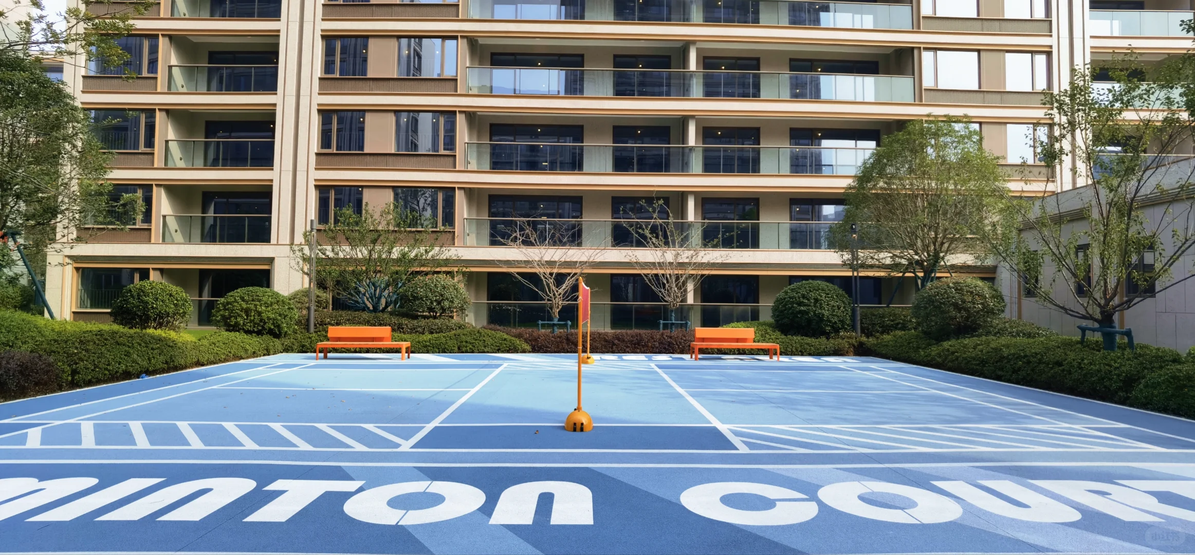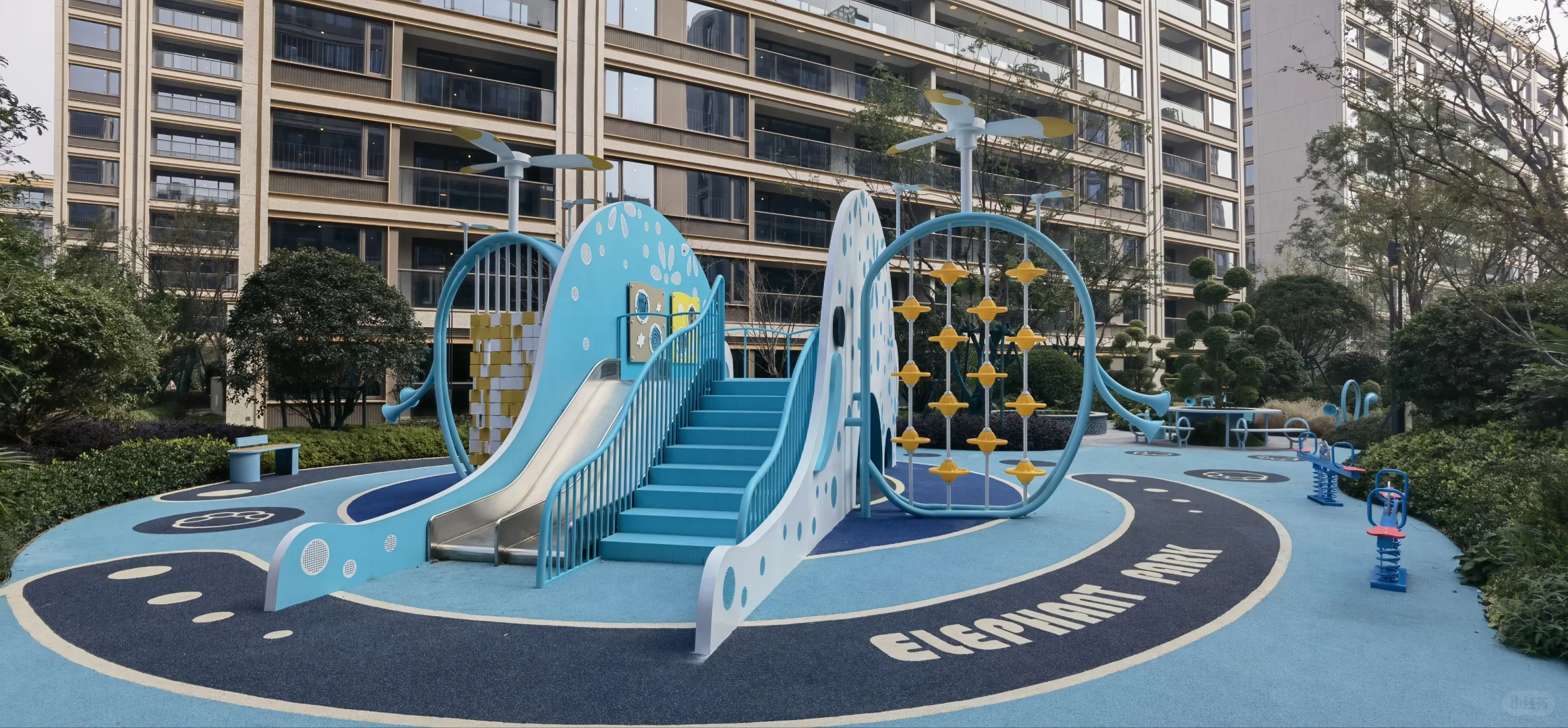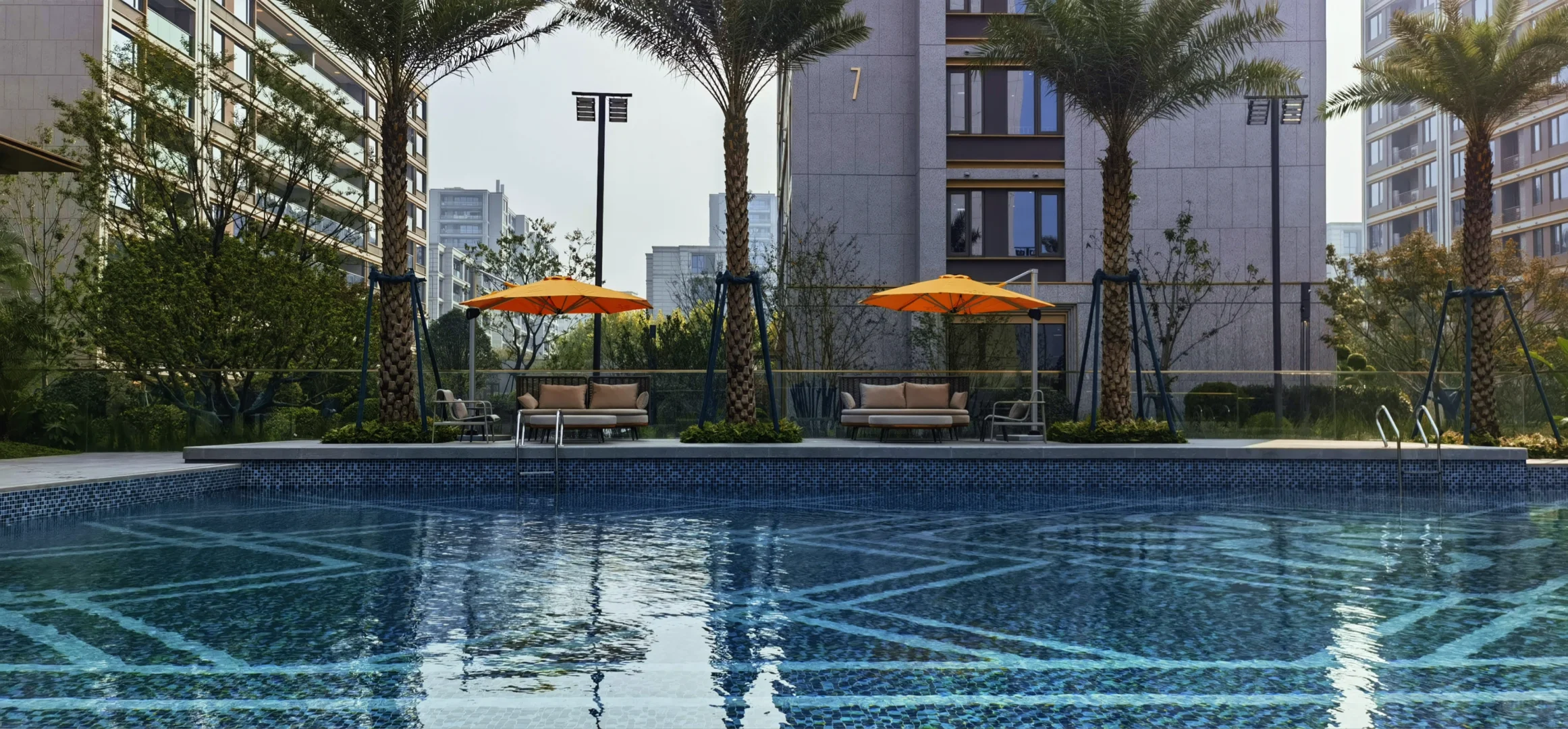 3、洋房由于底层出去一般都是绿地,所以留给配套的空间是不大的,但春宸上府的楼间距相对比较开阔,就没有这个问题了,东面入户的水轴很有仪式感,小区中心位置有游泳池,底部还有拼花,挺漂亮的,泳池的北面和南面都做了会客功能空间,加强了交互性,其他还有像大草坪、童玩空间、羽毛球场等配套空间。