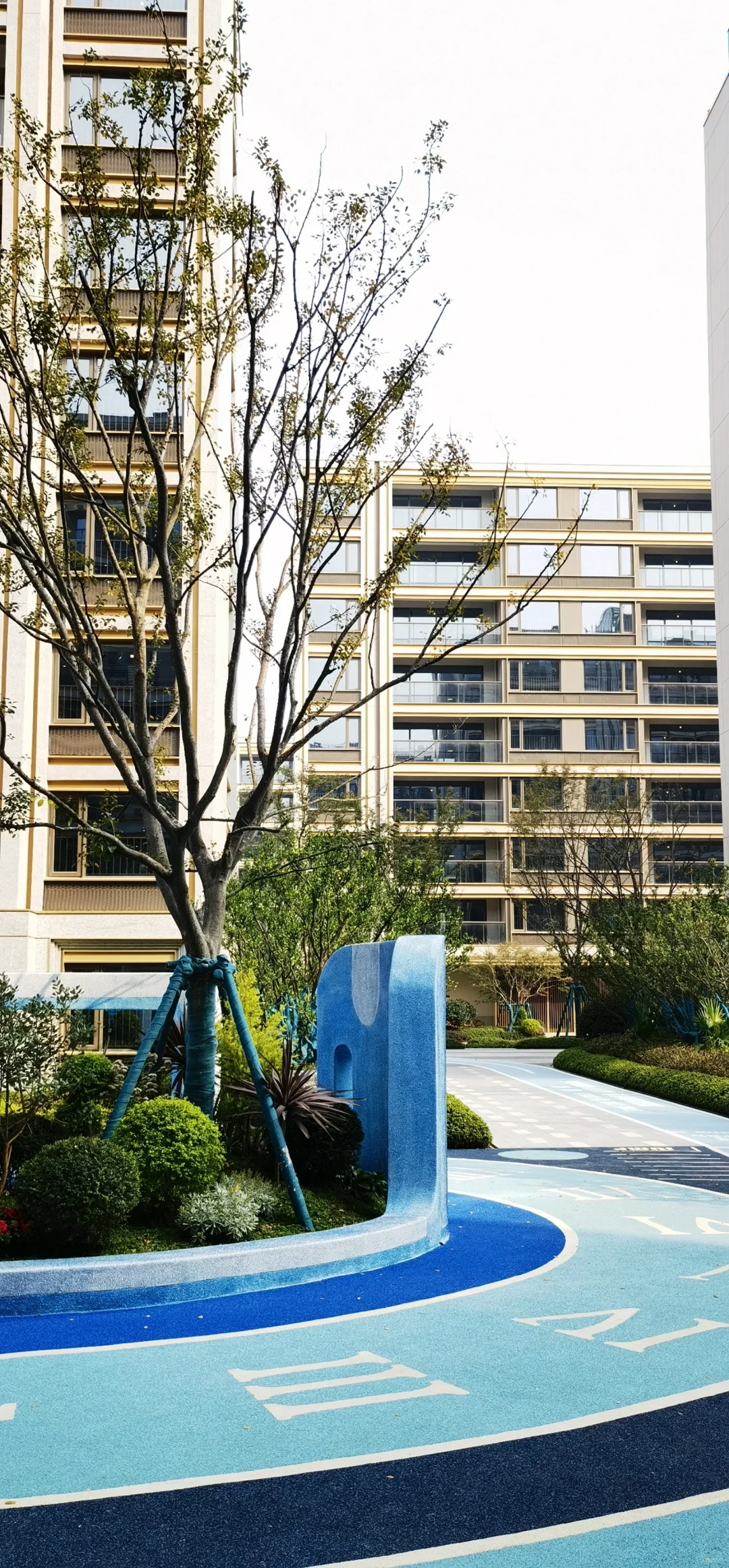 4、架空层带主题的应该就是中间几幢,我看到了阅读空间、儿童空间和健身空间,软装还没完全摆好,但从硬装上看风格偏于小清新,比较温暖,架空层的人景互动也做得很好,封闭式的健身房的跑步机有一些是直接对窗的,能看到窗外的风景;单元楼门厅我比较喜欢大门的那个金色的金属格栅,这比一般洋房小区的灰色金属格栅好看太多了。