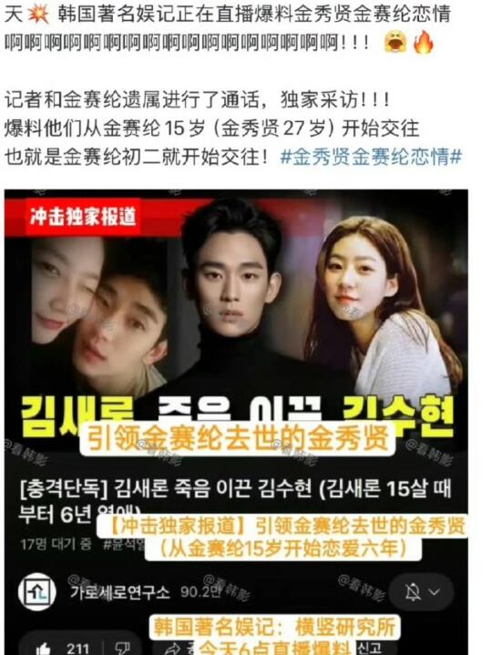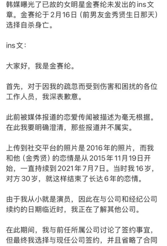 从目前的爆料来看,金赛纶被曝与金秀贤交往六年,从她15岁开始,当时金秀贤27岁。金赛纶生前未发出的ins也曝光了这段关系,她提到两人从2015年11月19日开始交往,直到2021年7月7日结束。这段关系确实存在很大的年龄和权力差距,而且金赛纶当时还是未成年。