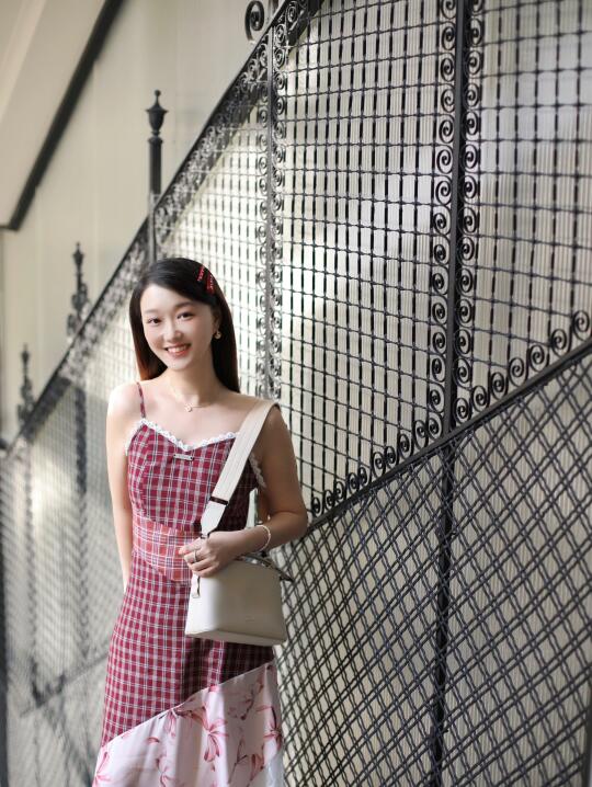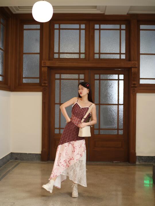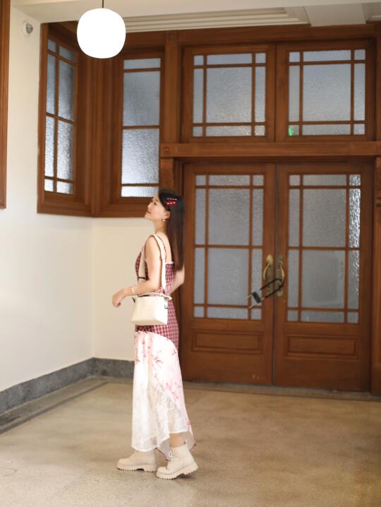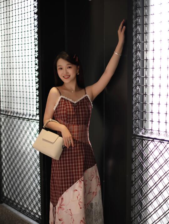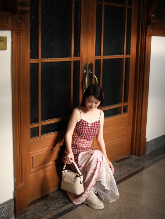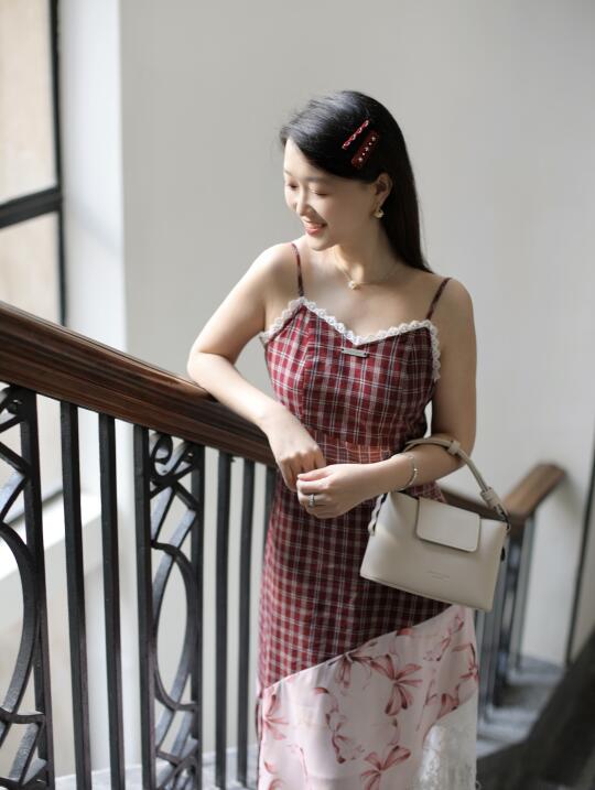 穿了红格子吊带裙👗➕奶油白小方包👜🟰行走的草莓奶油蛋糕🍰