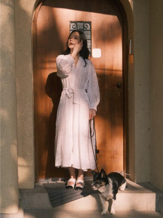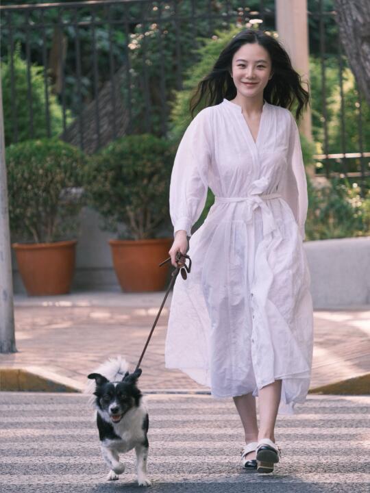 和小狗Bobby穿过叶影斑驳的桃江路,身着这条春夏白色连体裙为我充分成全夏日的气氛