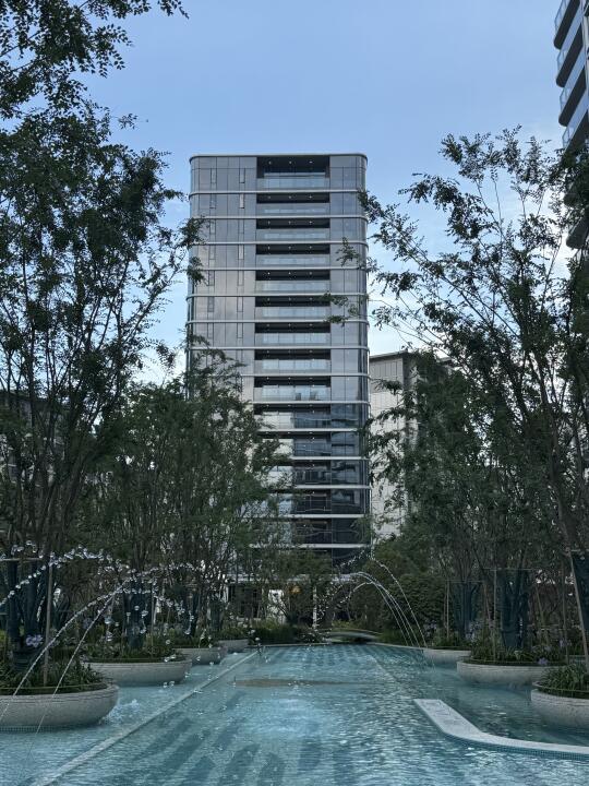 芝澜月华这个外立面也太好看了吧!横向融入的灰绿色陶板装饰,还挺前卫的。陶板替代普通格栅,提升了细节精致度。大面积玻璃幕墙搭配银白色铝板,形成轻盈通透的视觉效果,同时增强自然采光,使室内外空间界限模糊。