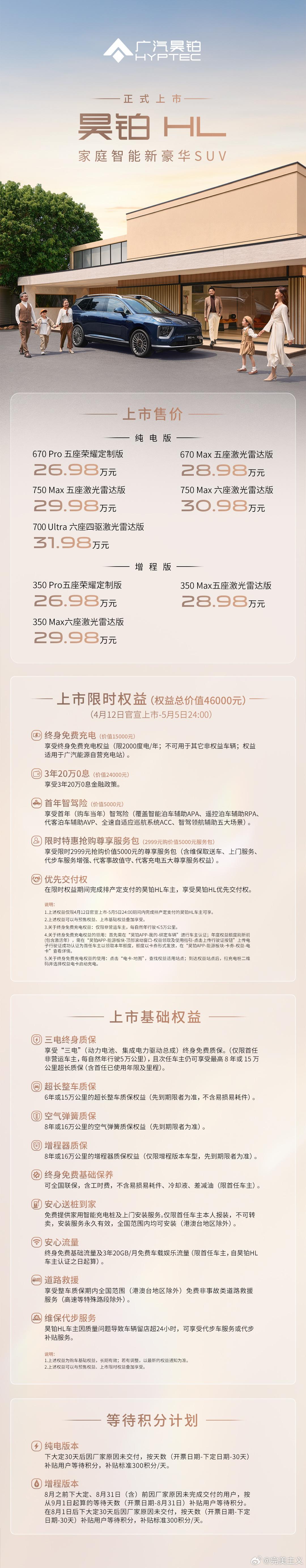 不仅价格上有优势,权益方面昊铂HL三电终身质保+ 20万三年免息+首年300万智驾险+终生免费充电(每年2000度电)……
