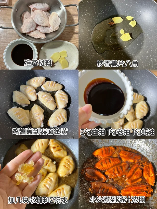 1️⃣炒香姜片和八角,下入鸡翅煎到双面金黄,倒入碗汁和几块冰糖