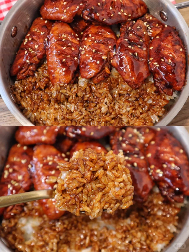 3️⃣把鸡翅铺在米饭上,淋入汤汁,拌匀就可以吃了😋