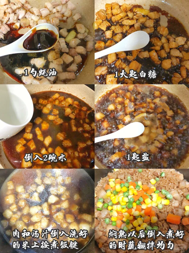 2️⃣姜片爆香以后加入五花肉小火煸炒到变色加入一勺料酒 2勺生抽 1勺老抽 1勺蚝油,翻炒均匀倒入2碗水(米饭多的话就多加一些水,这是用来焖饭的肉汁),水开加1大匙白糖和一匙盐