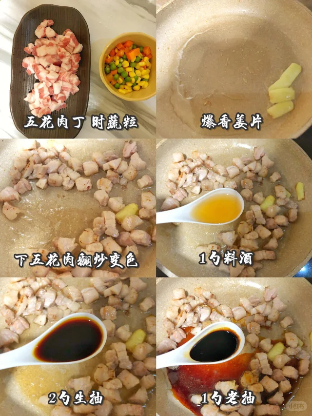 1️⃣五花肉去皮切丁 时蔬粒煮熟备用