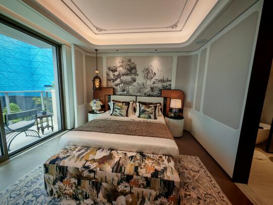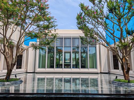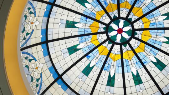 3、会所里现在在搞北山街的历史建筑展,这主要是因为湖山丽舍的建筑造型参考了北山街的那批建筑,具体哪里像后面到外立面部分我会详细展开。会所印象比较深的主要就是穹顶,用了2400片特质玻璃组装而成,组装成西湖中荷花的纹样,中西结合,很有感觉。