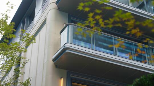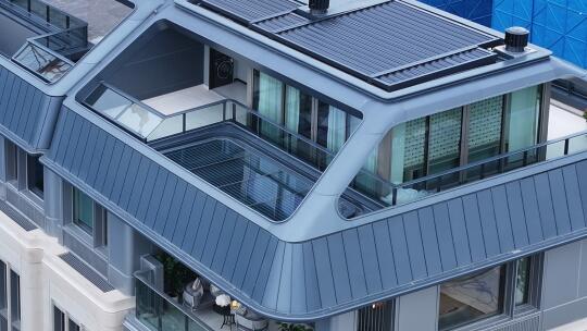 5、终于到了我最喜欢的外立面了,这个外立面是我最近看过的低密里最漂亮的。用了进口莱姆石、铝板与大面积玻璃,顶楼融入法式类孟莎式屋顶元素,这和北山街的新新饭店是一样的,非常的复古。