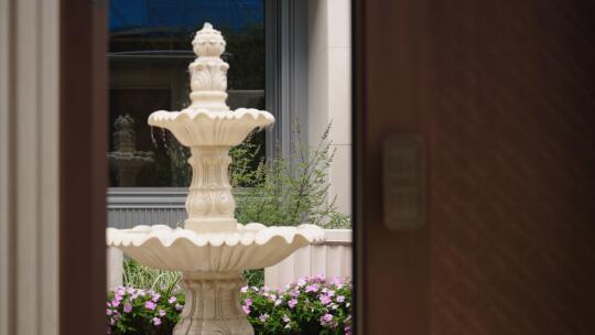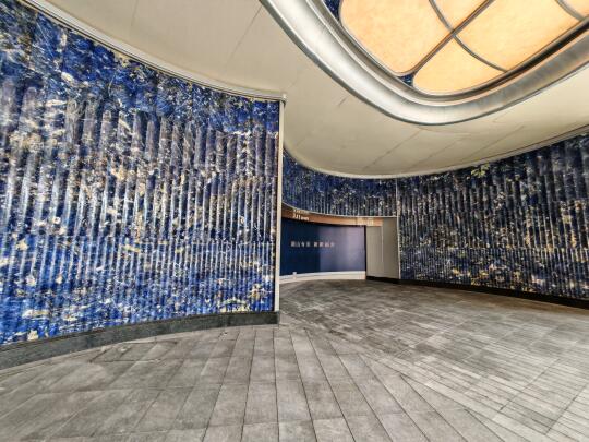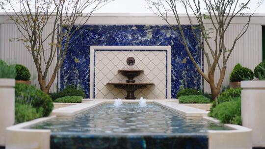 4、会所后方的中轴景观水系,用了马达加斯加顶级的蓝翡翠奢石,立面景墙是景泰蓝奢石和莱姆石,景墙中心设计了一尊黄龙吐翠铜雕,风水寓意很好。