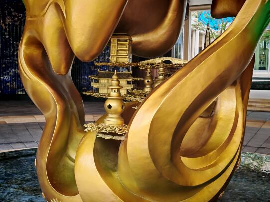 2、门头很大气,经典的车马院设计。中间是朱炳仁的铜雕,中心镂空部分可以看到三潭映月、断桥,还有湖山丽舍。两边是丽思卡尔顿酒店同款景泰蓝奢石打造的大面景墙…真够烧钱的。