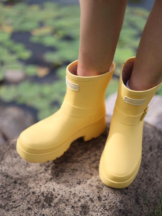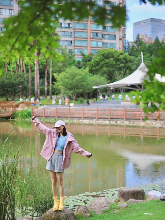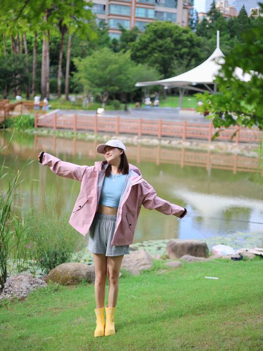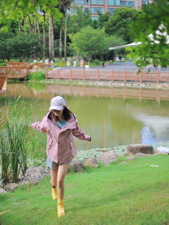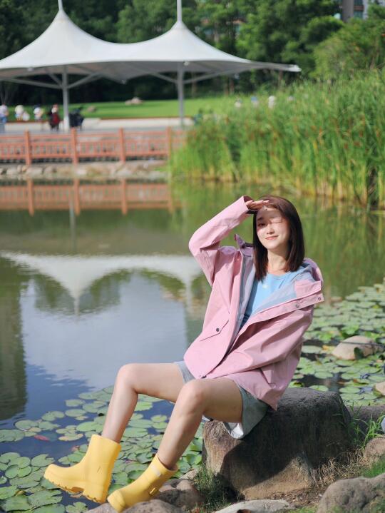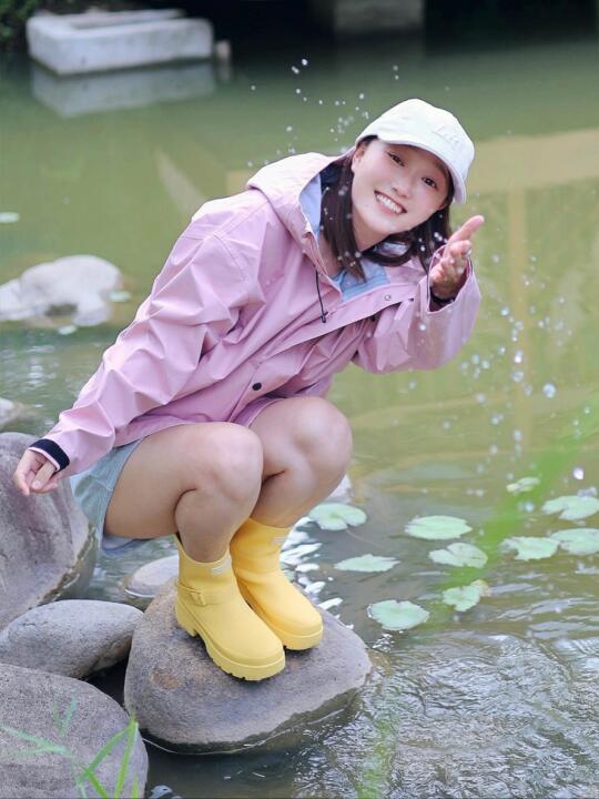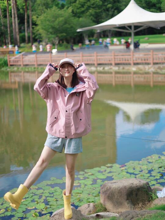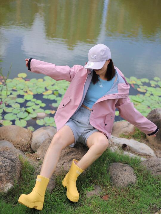 粉色冲锋衣🧥➕黄色短筒骑士雨靴👢,