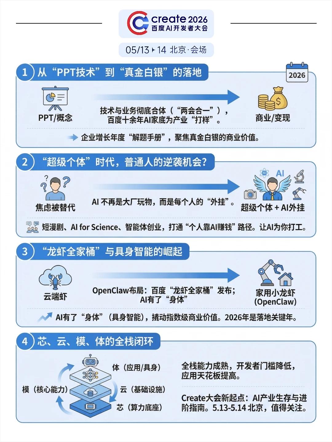 今年最大的变化就一个字:落。前几年大家都在卷参数、比模型大小,PPT吹得天花乱坠。但今年主题叫「万物一体」,百度把攒了十年的AI家底全拿出来给产业“打样”。而且两会合一——Create开发者大会和云智大会合办,技术和业务彻底拧成一股绳。想找增长的企业、个人开发者,这相当于年度解题手册。