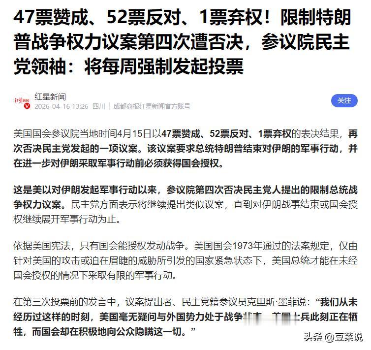 信息来源: 47票赞成、52票反对、1票弃权!限制特朗普战争权力议案第四次遭否决,参议院民主党领袖:将每周强制发起投票