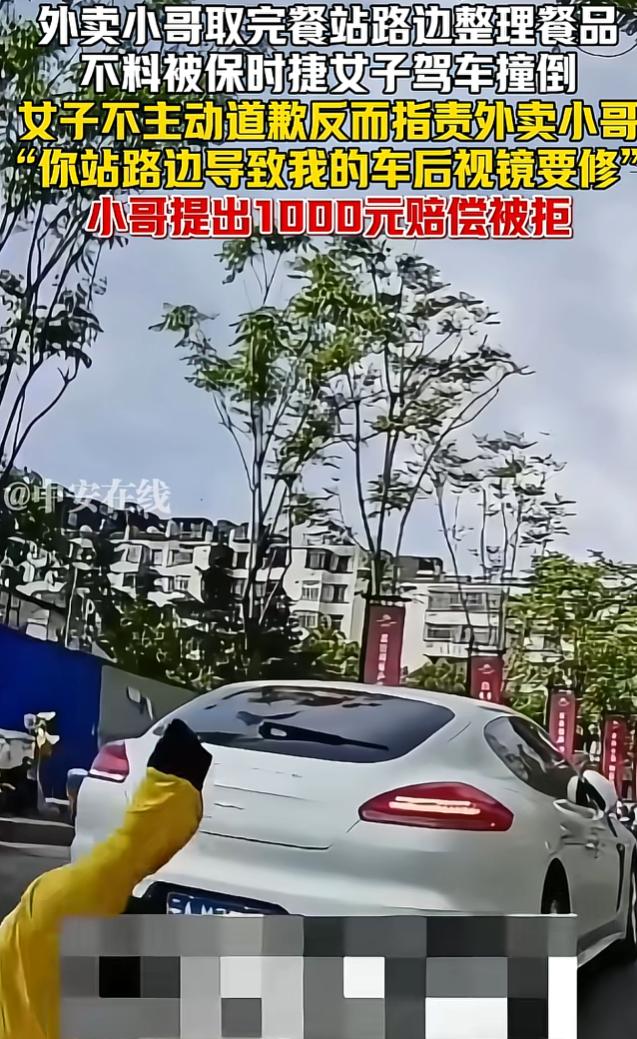 保时捷女司机把人撞倒后,不仅不道歉反而指责小哥破坏了后视镜。