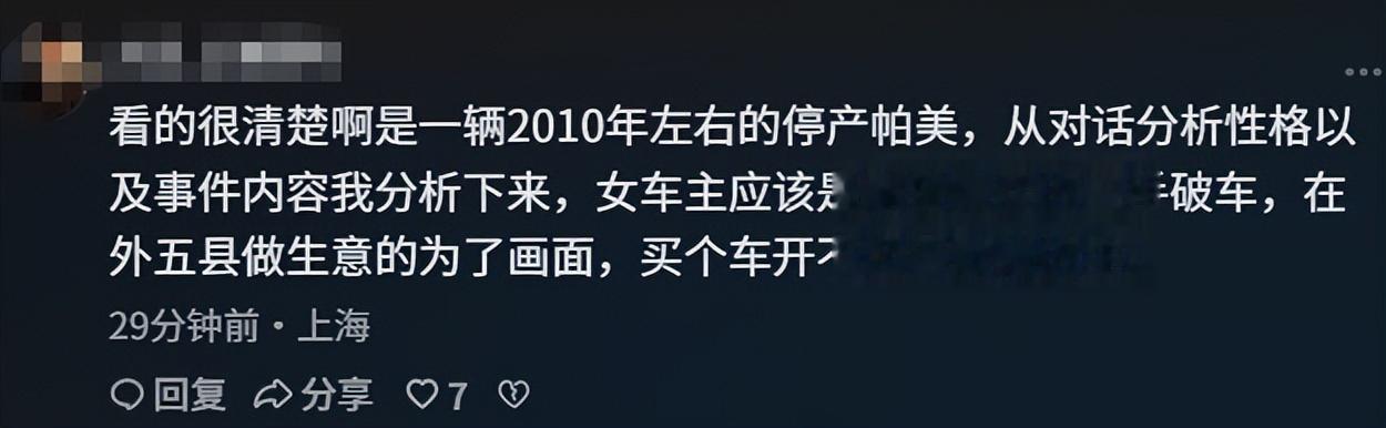 也有的网友根据视频中的保时捷车型和女司机的对话方式进行判断,直接刻画出了女司机的人物画像,认为女司机应该是刚贷款买的二手车,开不起也修不起。