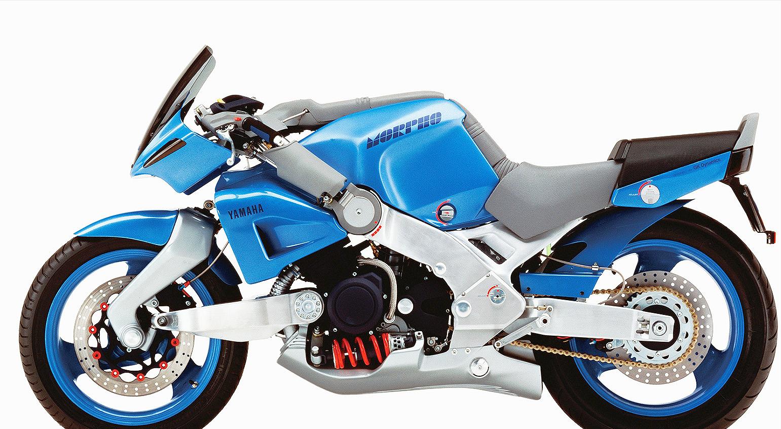 雅马哈的高层在80年代中期看到了这个潜力,双方一拍即合,当时的雅马哈正处于一种「科技过剩」的热血状态,他们不屑于只是做出一台很快的车,他们想要的是改变规则; 于是,在1989年的东京车展上,那台蓝色神秘的概念车Morpho横空出世,其科幻的外型与轮辐转向系统,让全球车迷意识到,这群日本人是玩真的。