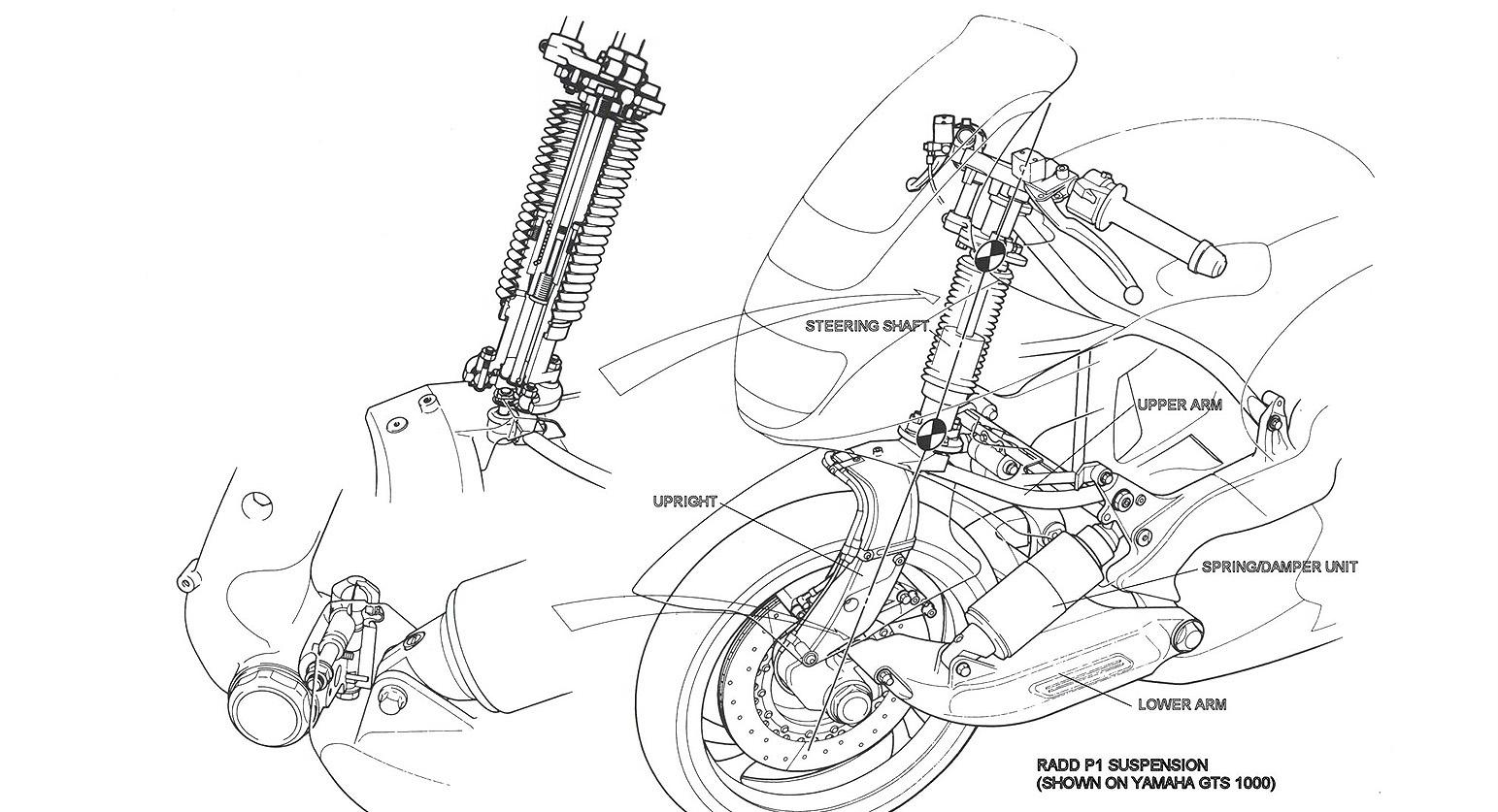 这段疯狂旅程的起点,要从一位名叫 James Parker 的美国人说起,这位老兄并非雅马哈内部的员工,而是一位对悬吊系统充满热情的发明家,他研发出一种名为 RADD 的转向结构,能让前轮在作动时不改变轴距与拖曳距,并解决了传统前叉在重刹时会「锁死」吸震能力的物理缺陷。