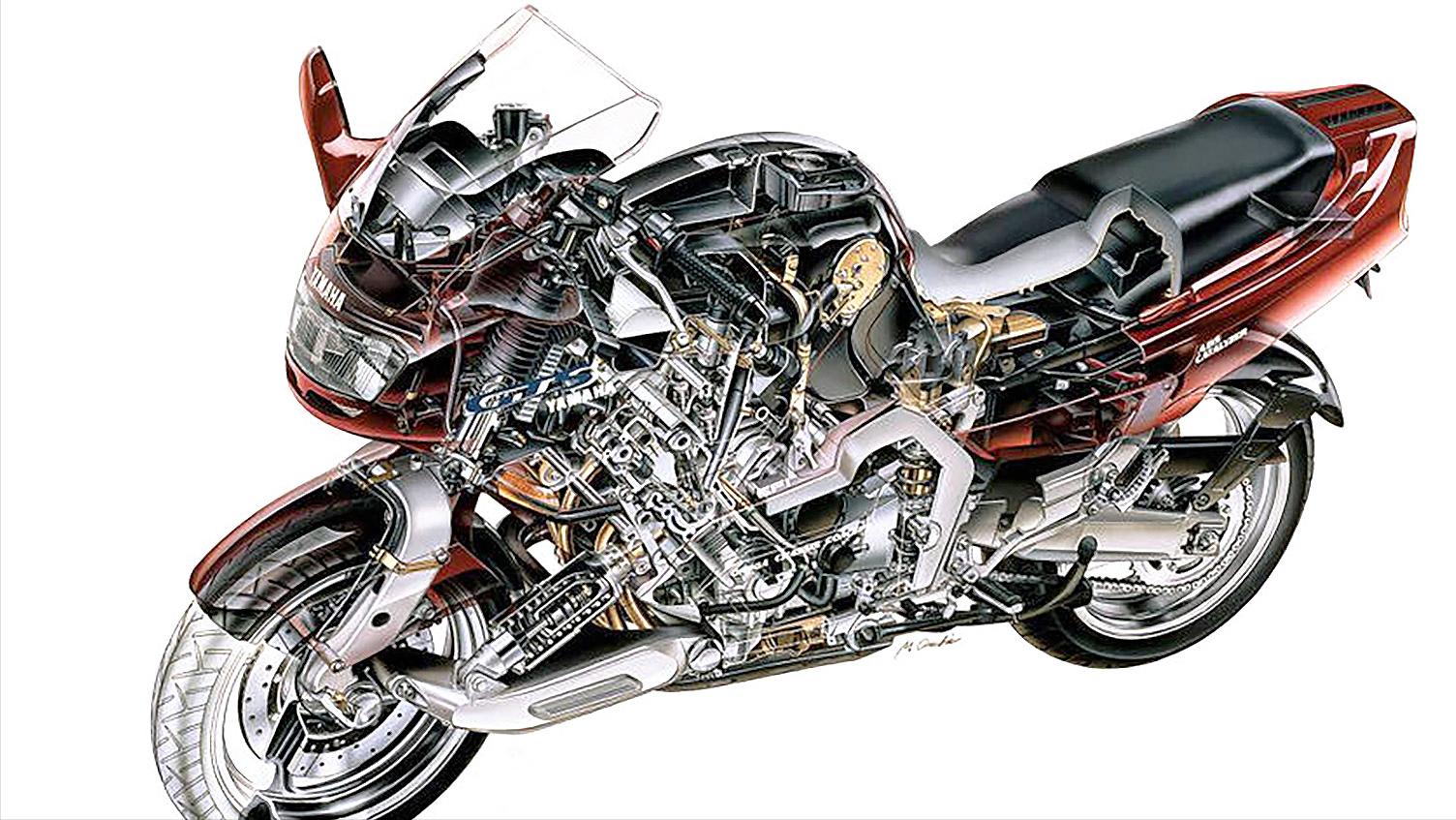 为了推动这台干燥重量 246 公斤、全负载(湿重)接近 275 公斤的庞然大物,雅马哈搬出了当家的 FZR1000 心脏。 这具排气量 1,002cc 的水冷四缸引擎,拥有山叶引以为傲的 DOHC 每缸五汽门技术,缸径行程比为 75.5mm x 56.0mm。