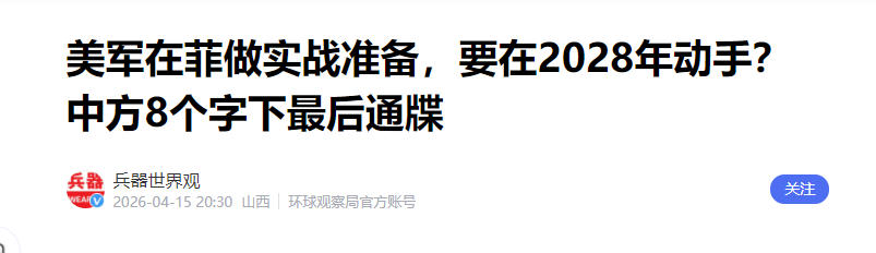美军在菲做实战准备,要在2028年动手?中方8个字下最后通牒 兵器世界观 2026-04-15 20:30 山西 环球观察局官方账号