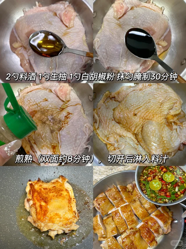 2️⃣2勺料酒1勺生抽1勺白胡椒粉抹匀腌制30分钟,煎熟(双面约8分钟) 切开后淋入料汁
