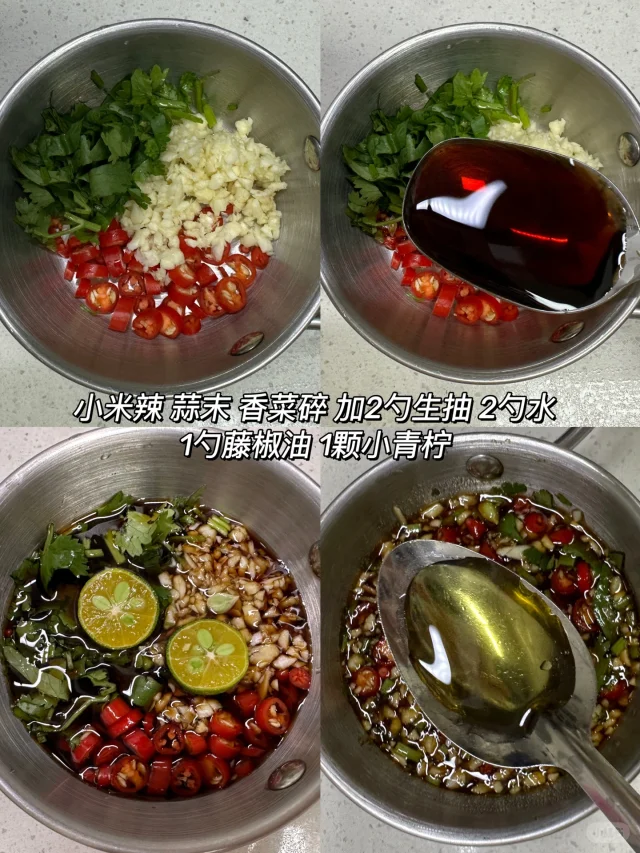 1️⃣ 小米辣蒜末香菜碎加2勺生抽2勺水 1勺藤椒油1颗小青柠挤出汁水搅拌均匀