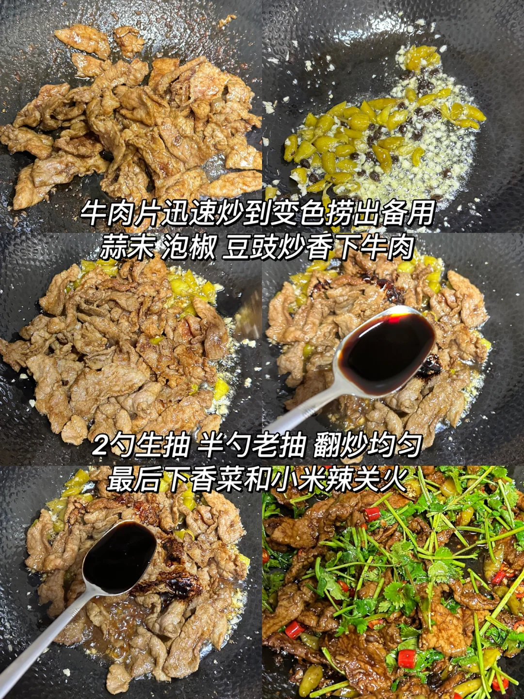 2️⃣ 牛肉片迅速炒到变色捞出备用蒜末 泡椒 豆豉炒香下牛肉,加2勺生抽 半勺老抽 翻炒均匀最后下香菜和小米辣关火