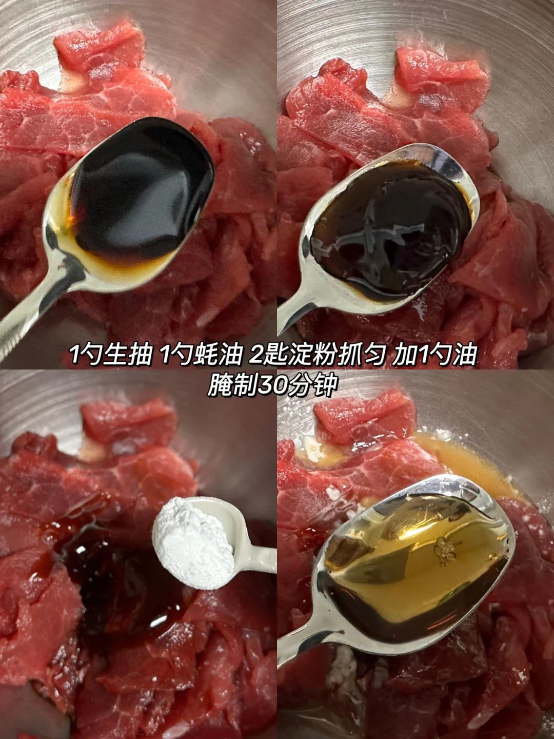 1️⃣ 1勺生抽 1勺蚝油 2匙淀粉抓匀 加1勺油,腌制30分钟
