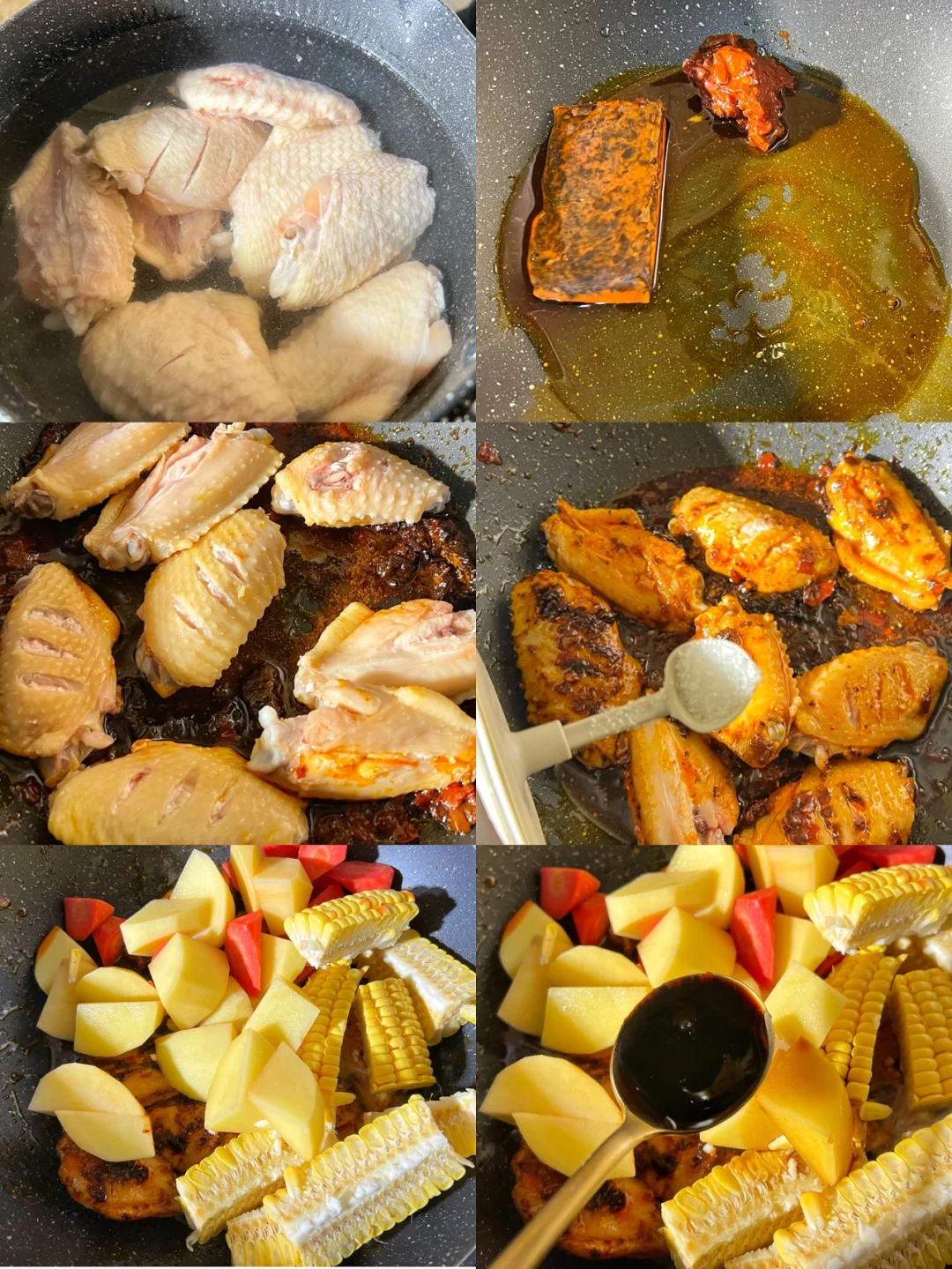1️⃣鸡翅焯水洗干净备用,土豆 胡萝卜 玉米切块
