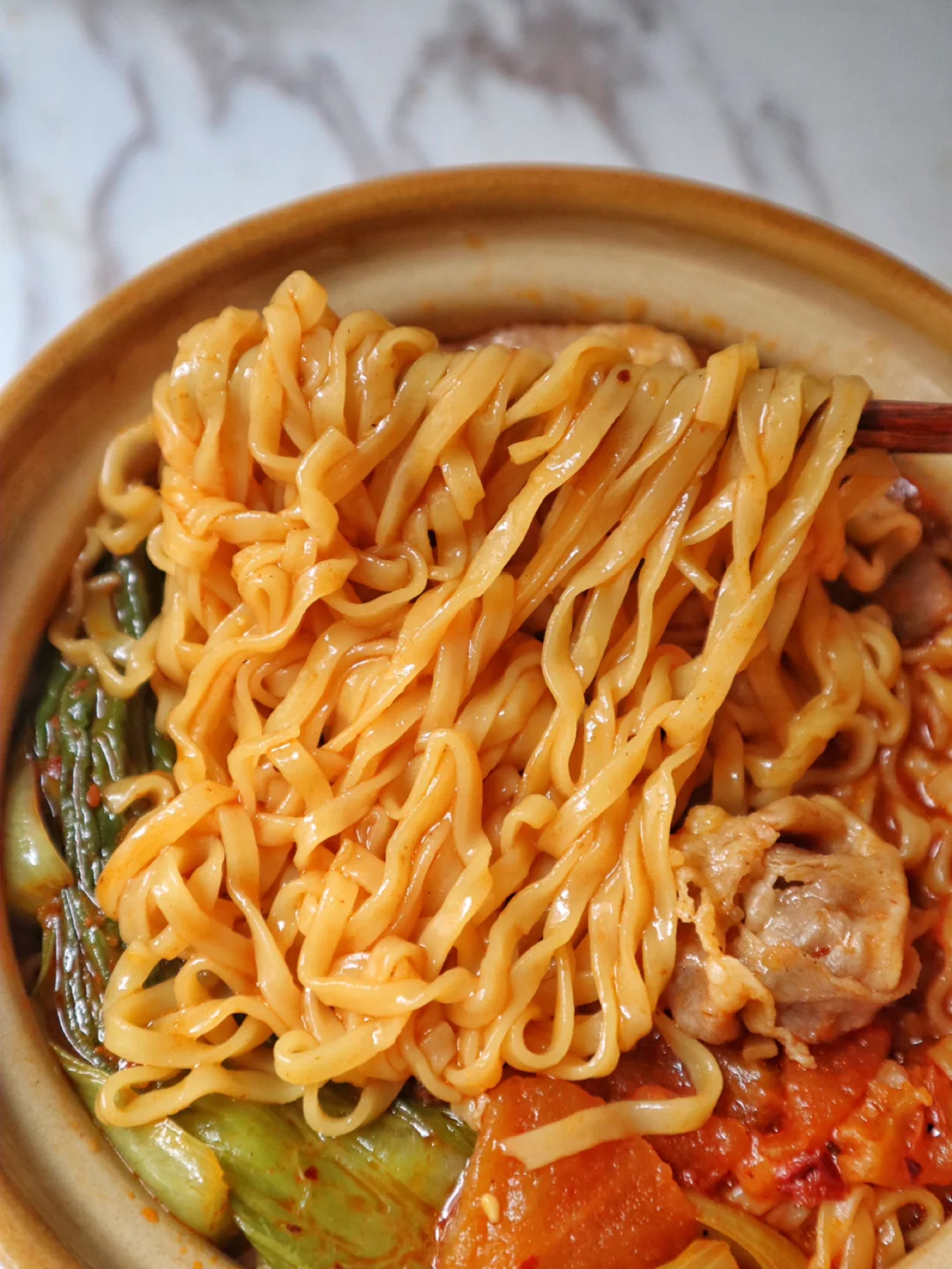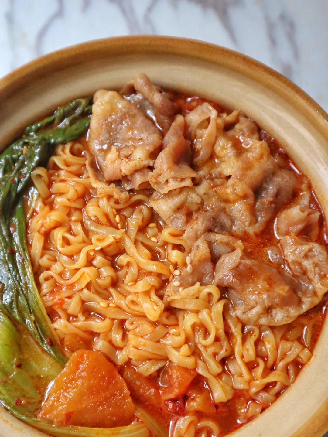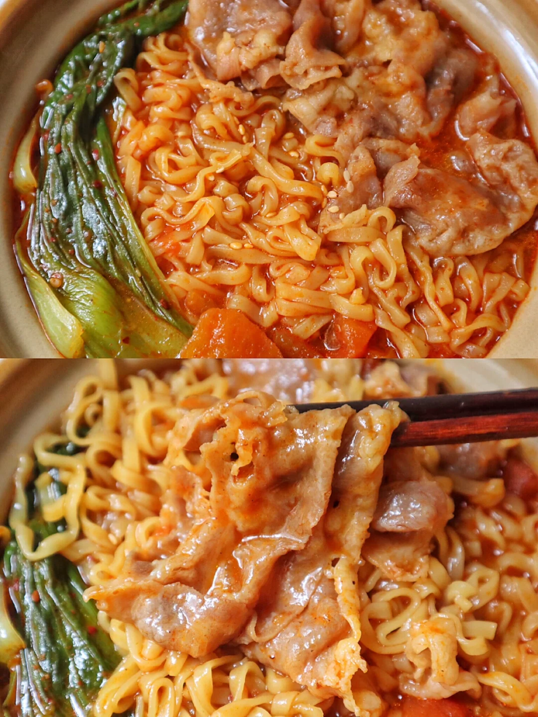 3️⃣下泡面和青菜煮熟,最后加肥牛煮15秒