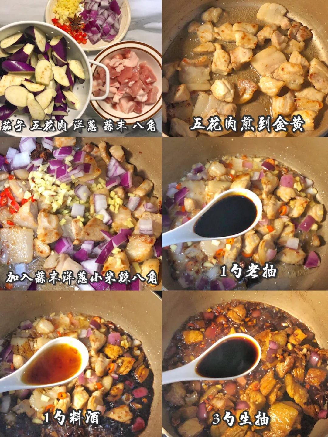 2️⃣锅里放一点油煎五花肉,煎到双面金黄出油,然后下入洋葱 小米辣 八角 蒜末,要用洋葱才香哦,炒香以后加1勺老抽,1勺料酒,3勺生抽调味