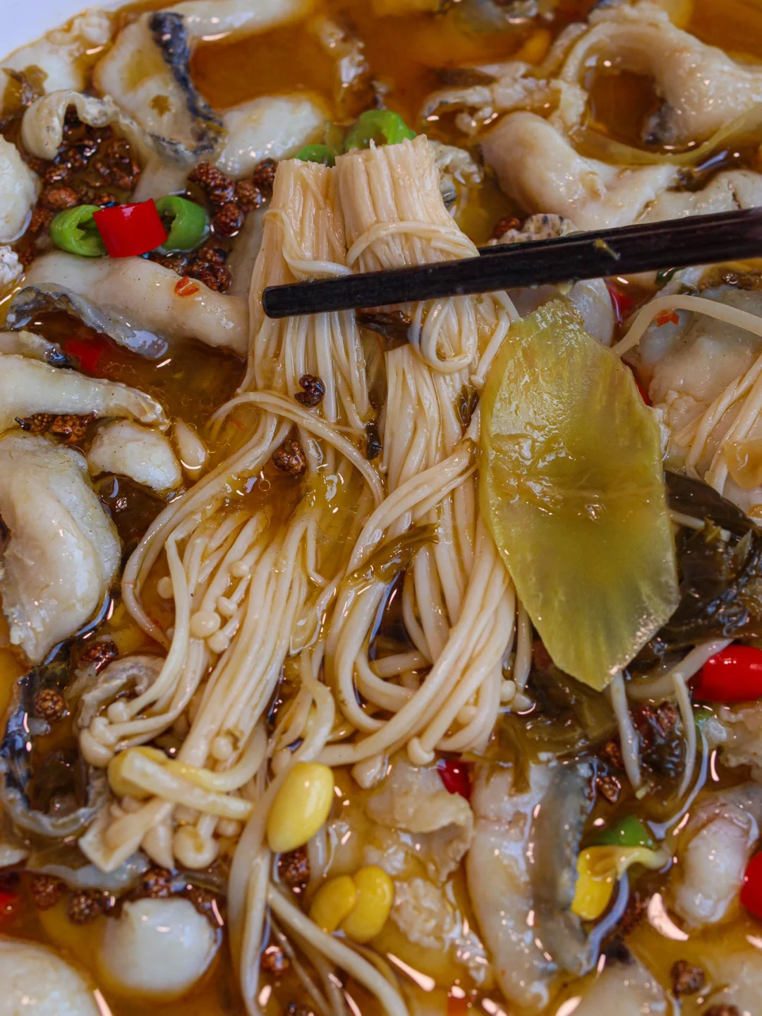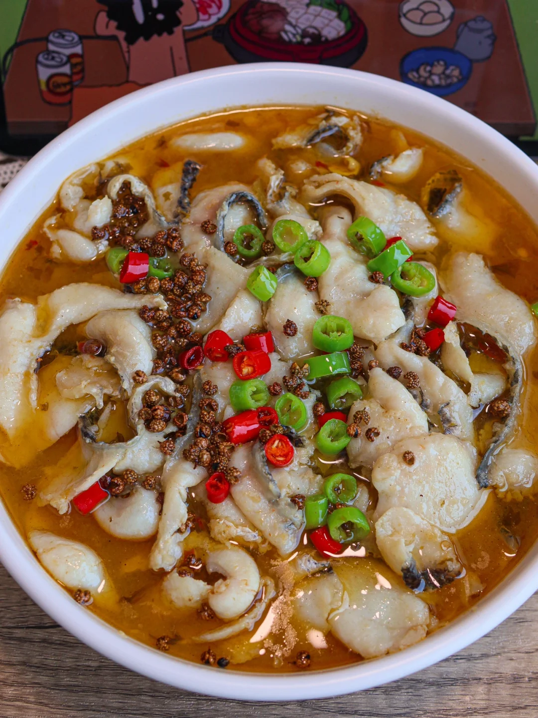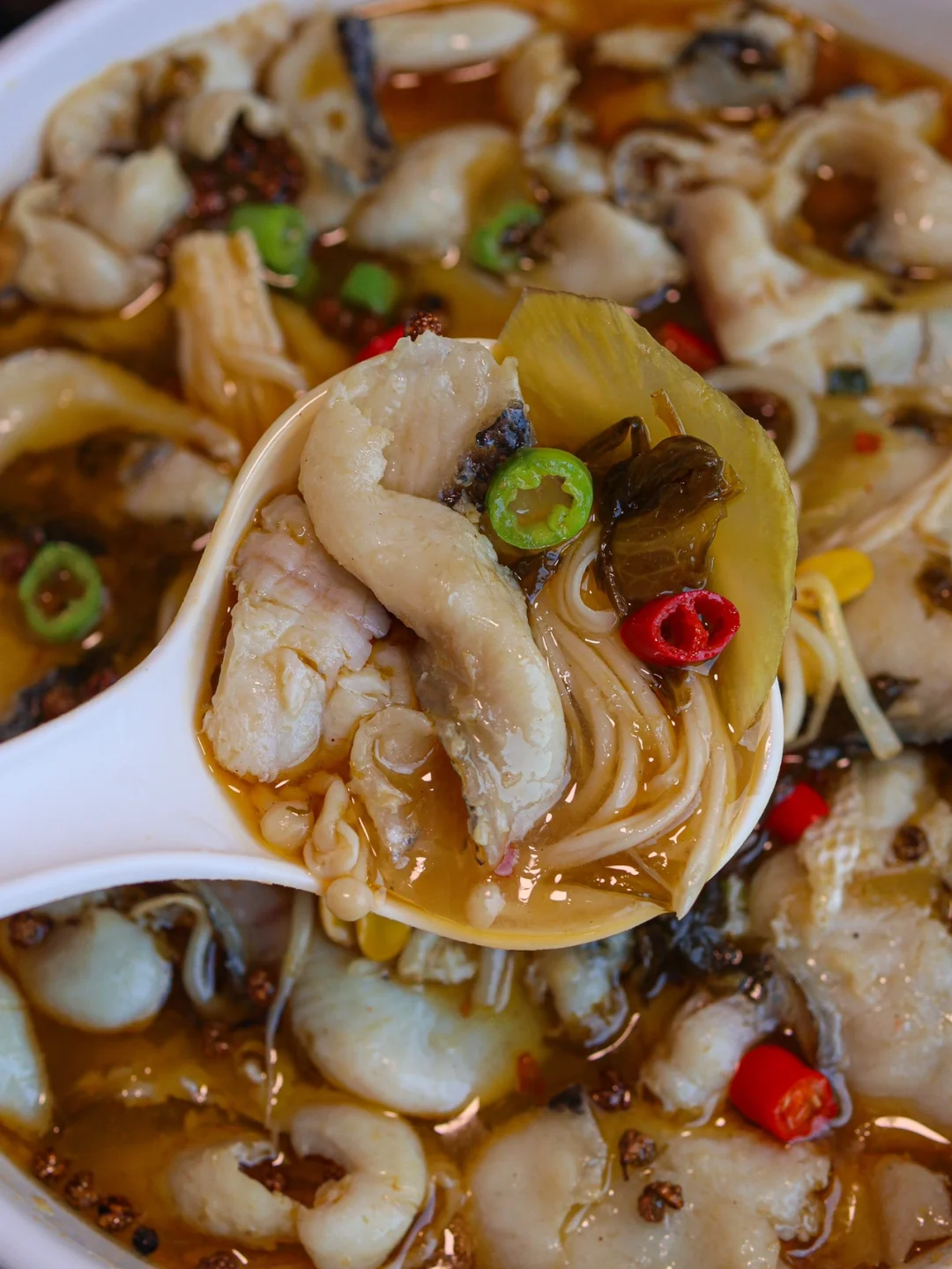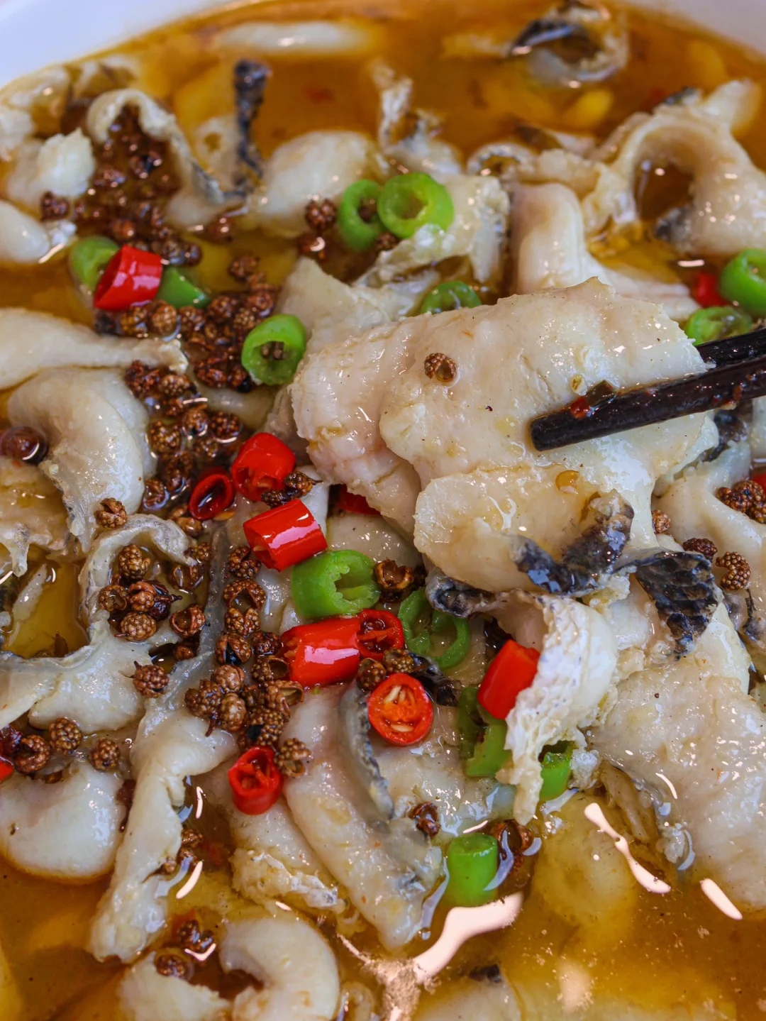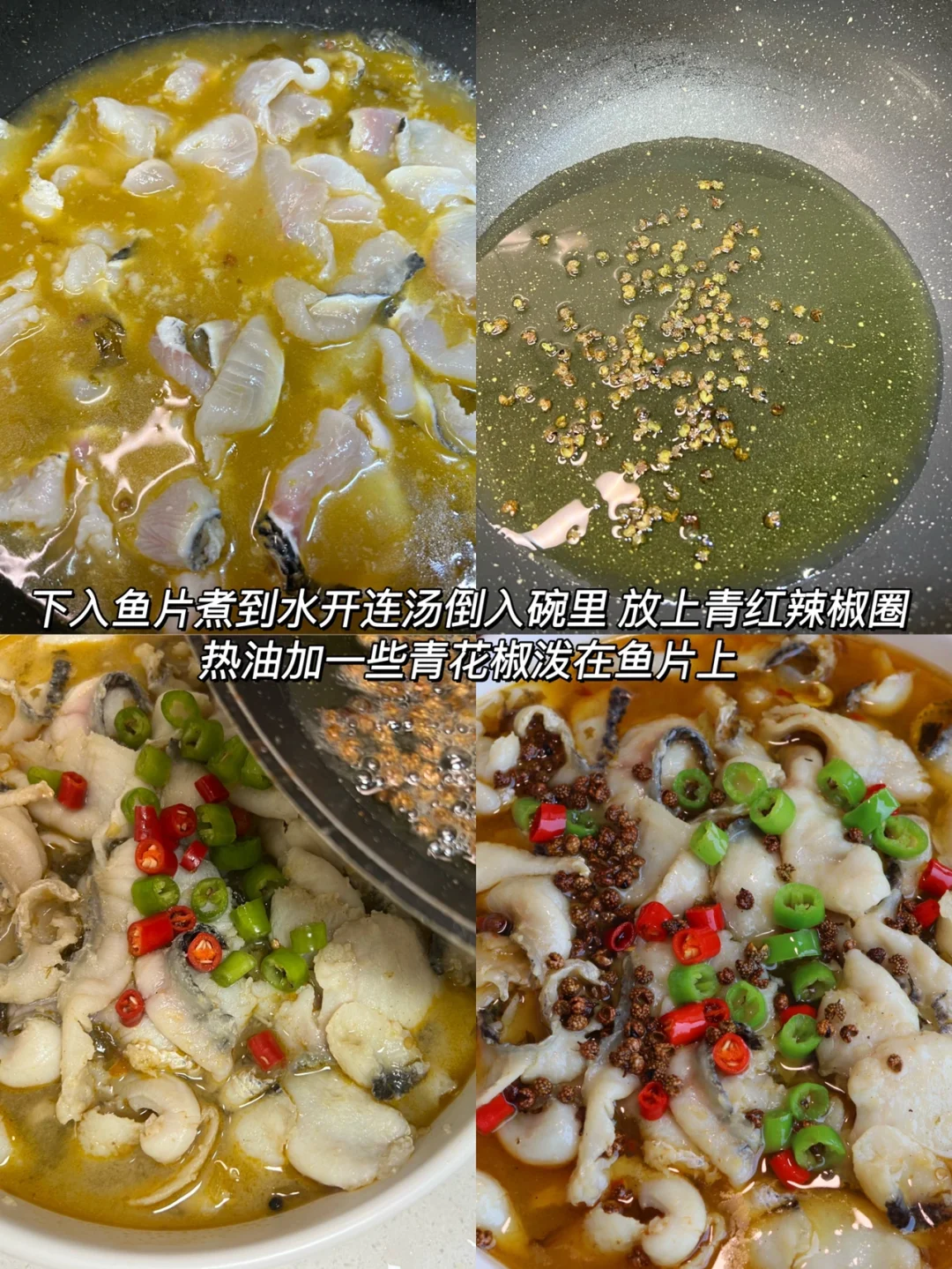 3️⃣下入鱼片煮2~3分钟水开就熟了,然后连汤带鱼倒在菜上,撒上青红辣椒圈,加青花椒粒热油,泼在鱼片上